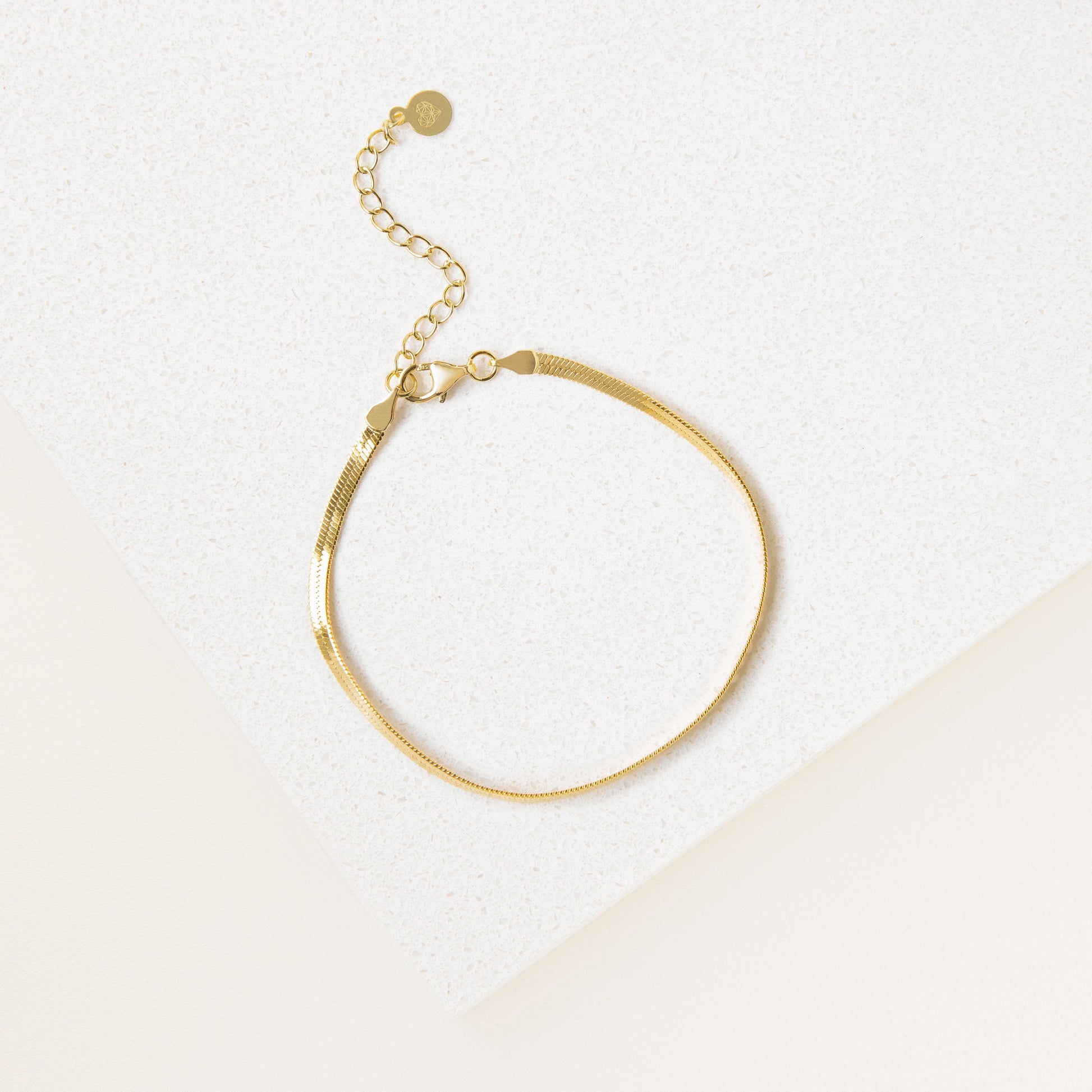 The Essential Bracelet Chains feature a delicate gold chain with polished finishes and an adjustable clasp, shown on a white textured surface.