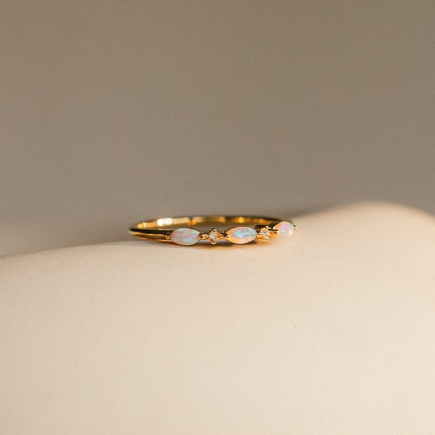 This ring is for the ones with gentle hearts and a soul that can't help but shine ✨ Inspired by the natural beauty of opals- our delicate Alessia Trio Opal Ring is adorned with 3 glimmering opal gemstones and 2 sparkling dainty diamond stones. This breathtaking ring is the perfect gift to take that next step or celebrate your love with your special someone.