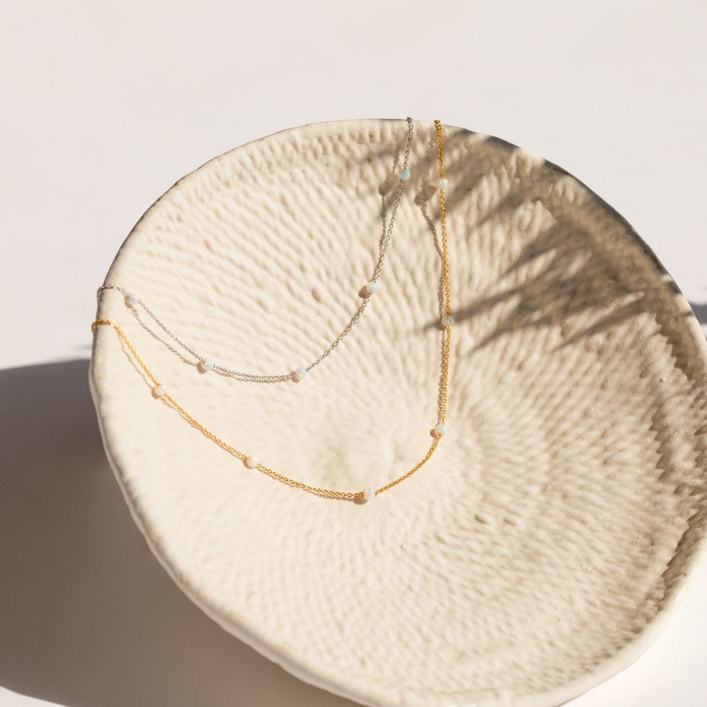 • Featuring ~3mm Opal Gemstones stationed around a dainty chain, adjustable from 16 inches to 18 inches