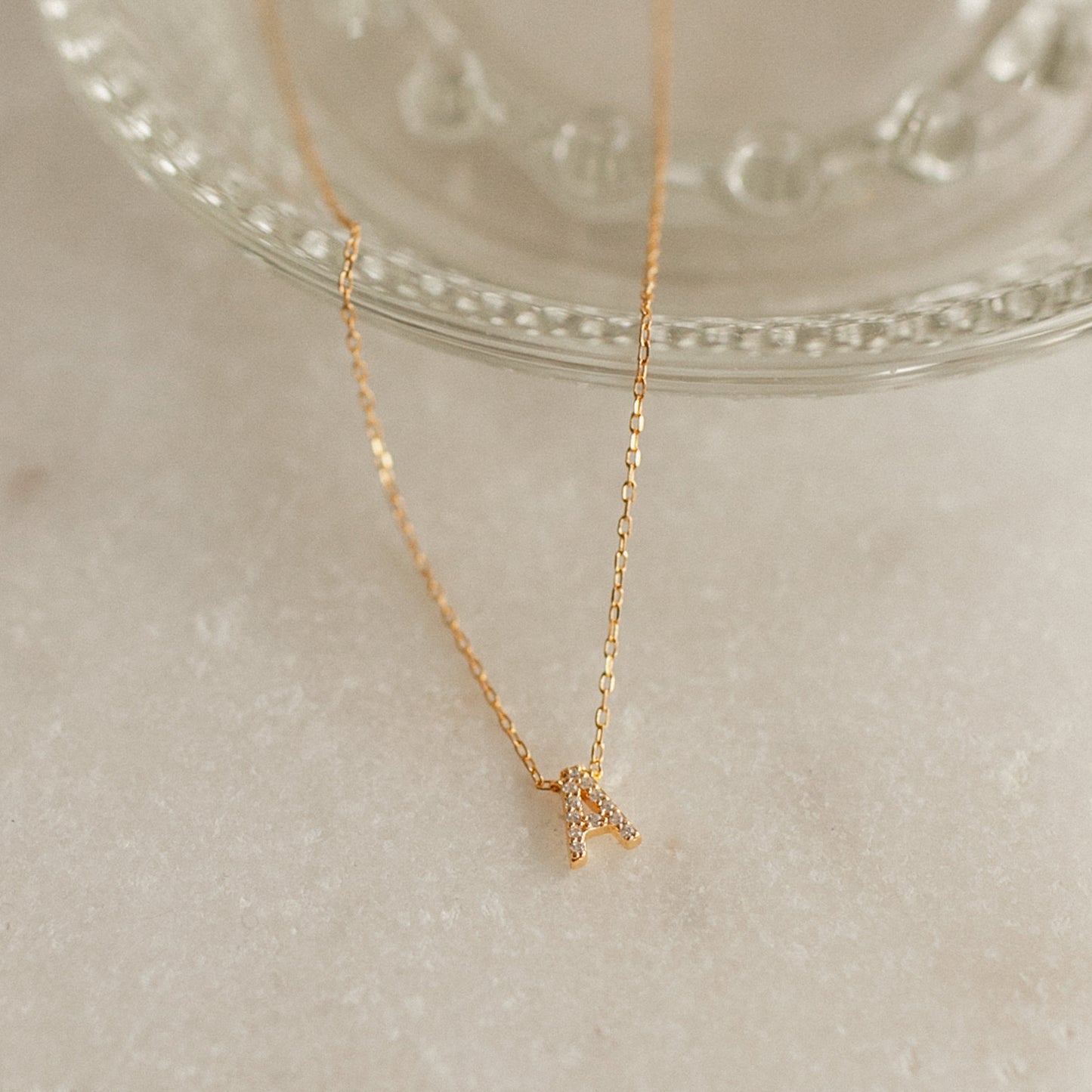 The Pave Initial Necklace features a small letter A pendant set with sparkling pave stones, displayed on a light, marble-like surface—an elegant and personalized jewelry piece.