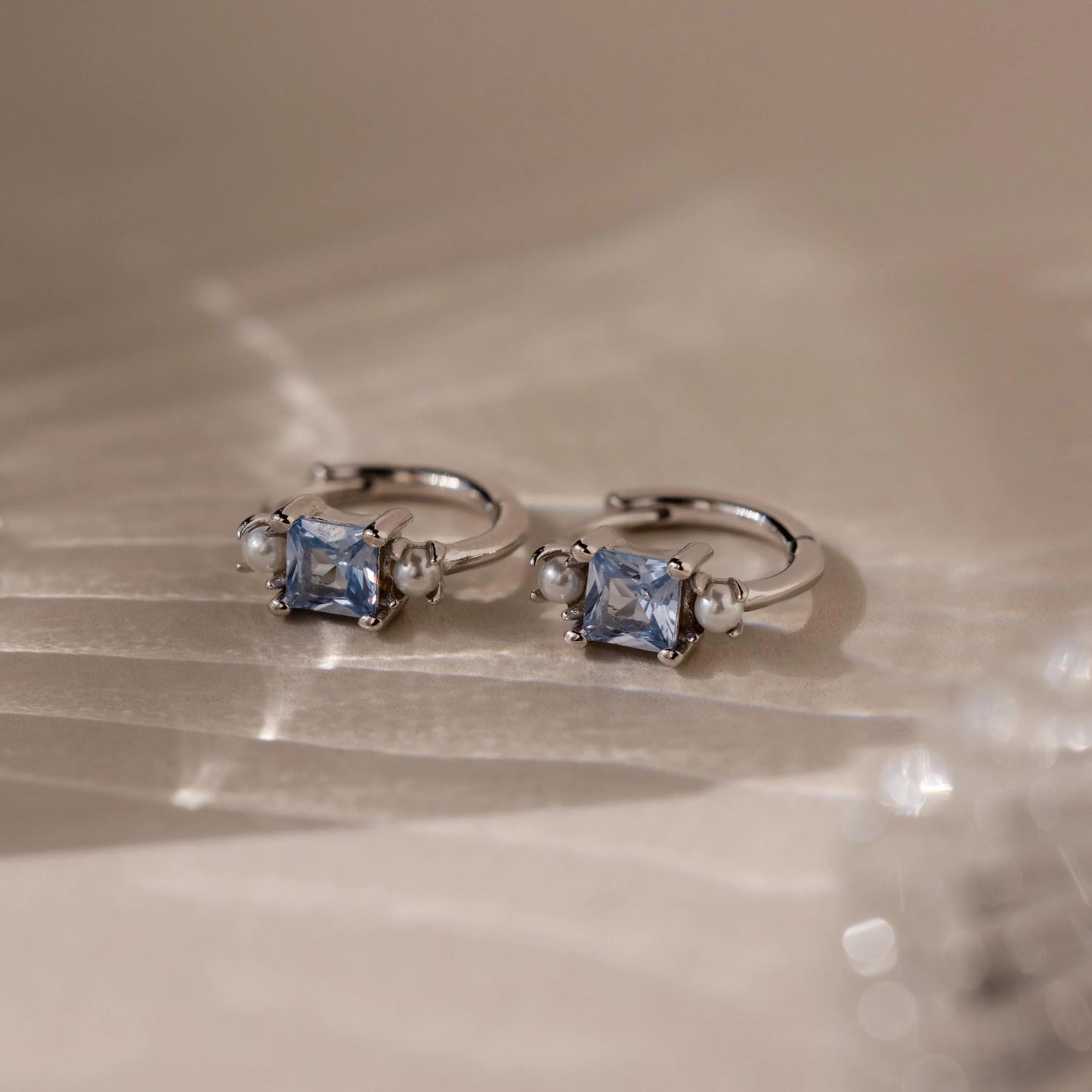 Aquamarine Pearl Huggies—gold hoop earrings with square blue gemstones and small pearls, perfect as bridal jewelry or wedding earrings—shown on a textured neutral surface.