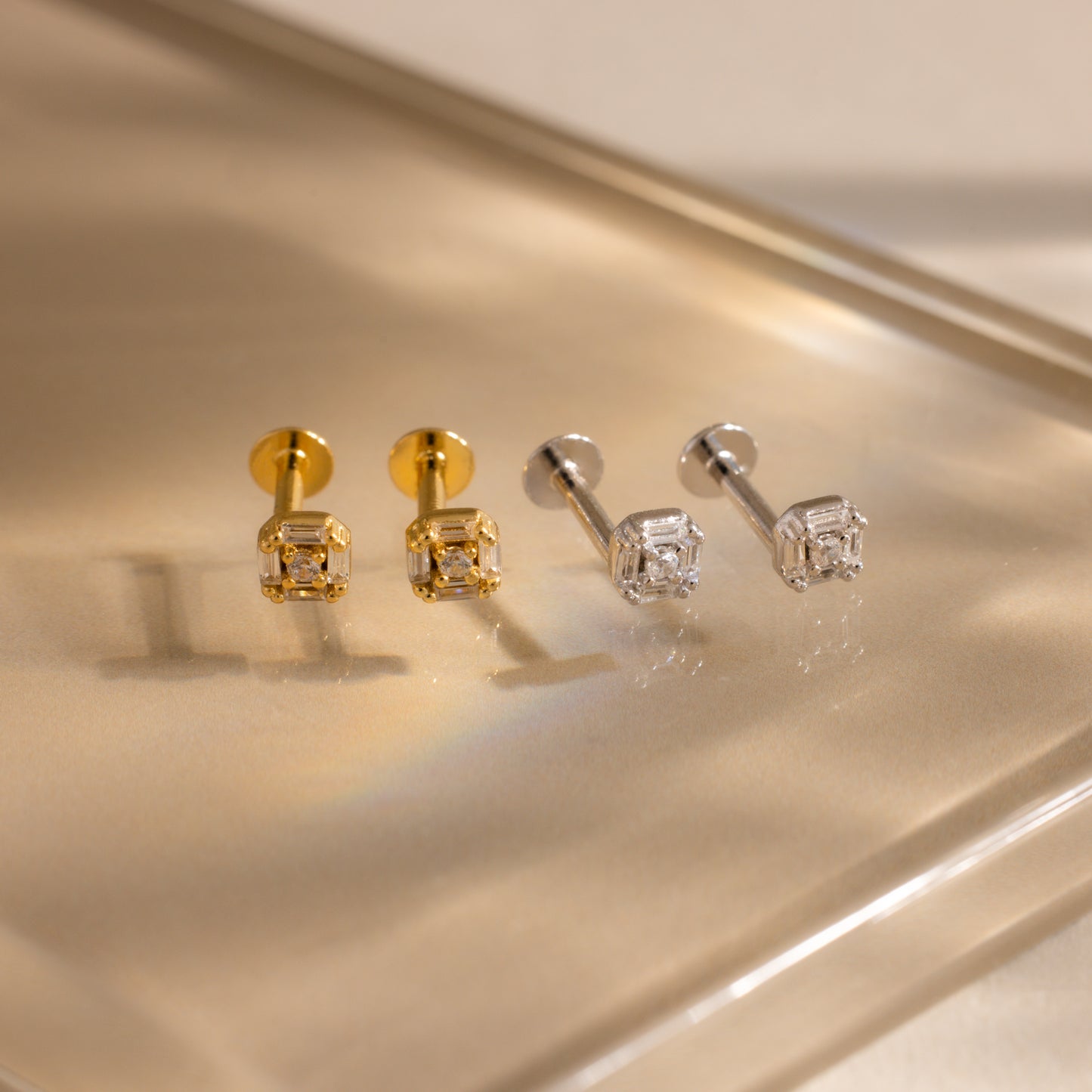 Pair of gold flatback earrings with vintage-inspired square diamond design on white marble.