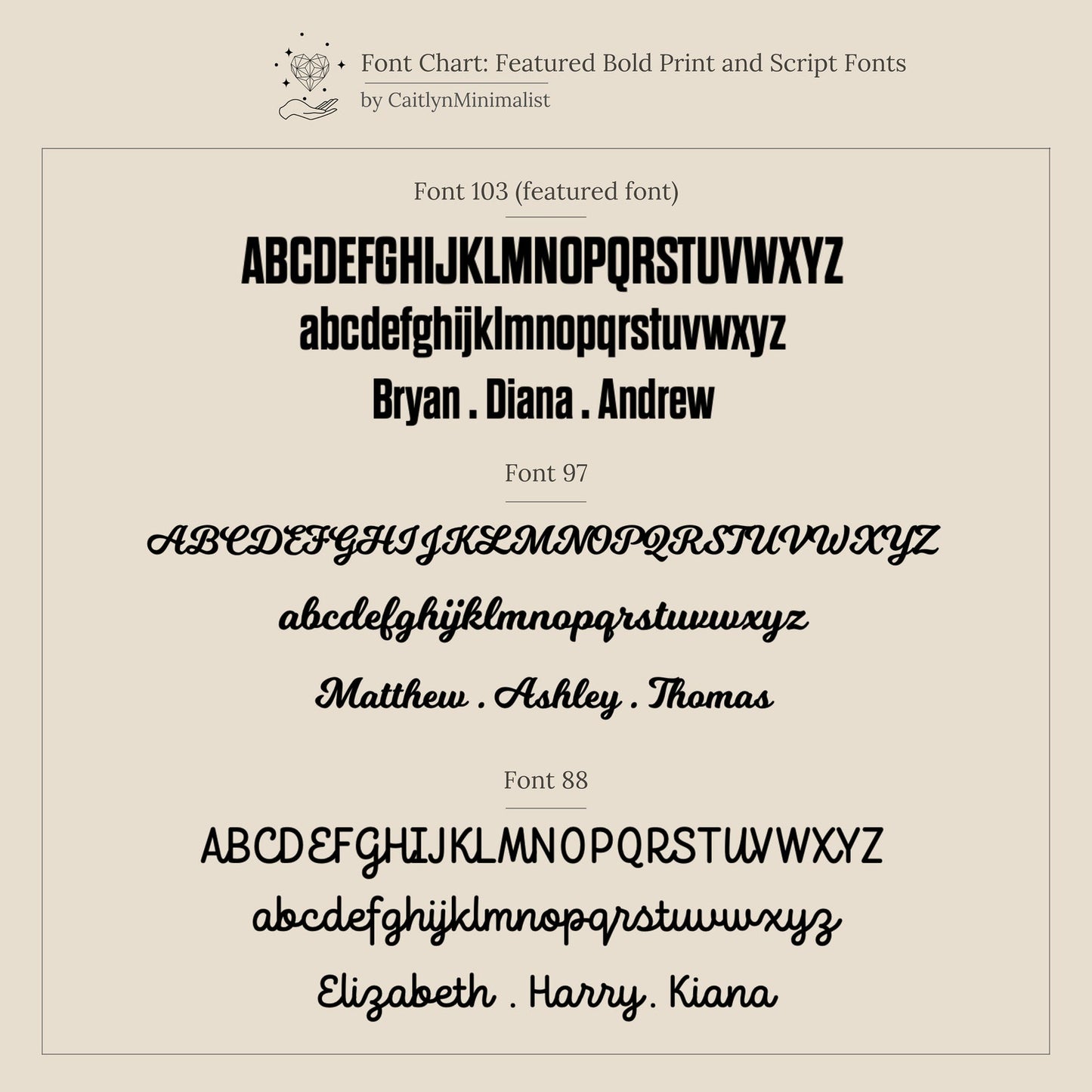 Si no se proporciona una fuente, recibirá la fuente que se muestra en la imagen de su pedido, que es la fuente 103 (nuestra opción de fuente más popular para este diseño)