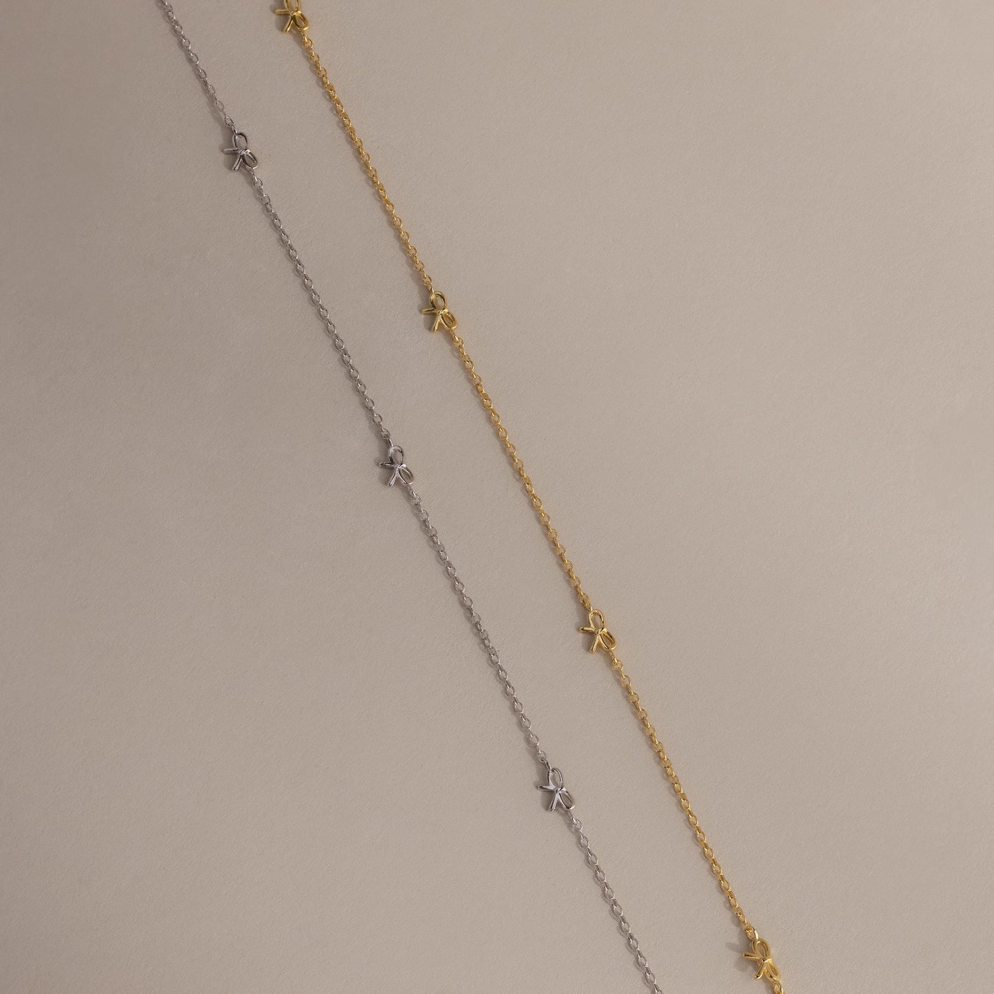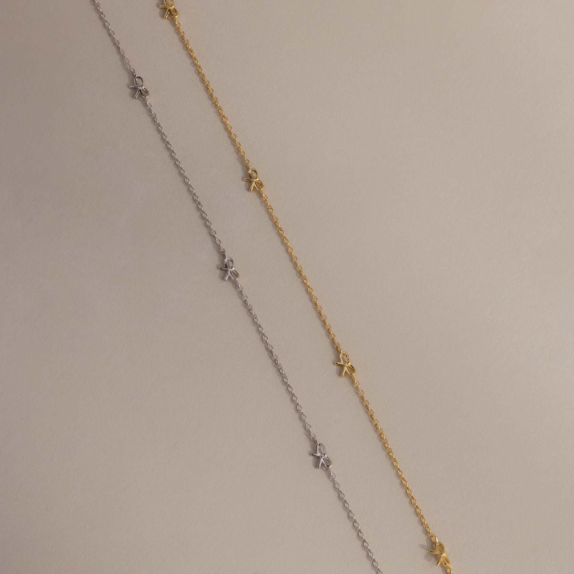 Delicate gold Bow Station Necklace draped over a curved neutral-toned surface.