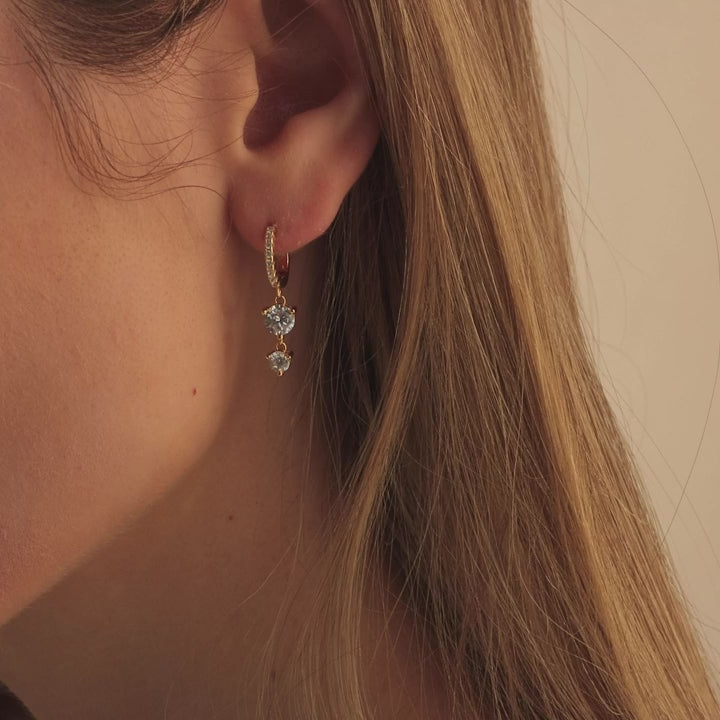 The Caroline Pave Drop Huggies feature gold-embellished hoops accented with small crystals and dangling heart-shaped clear gemstones, shown on a white surface.