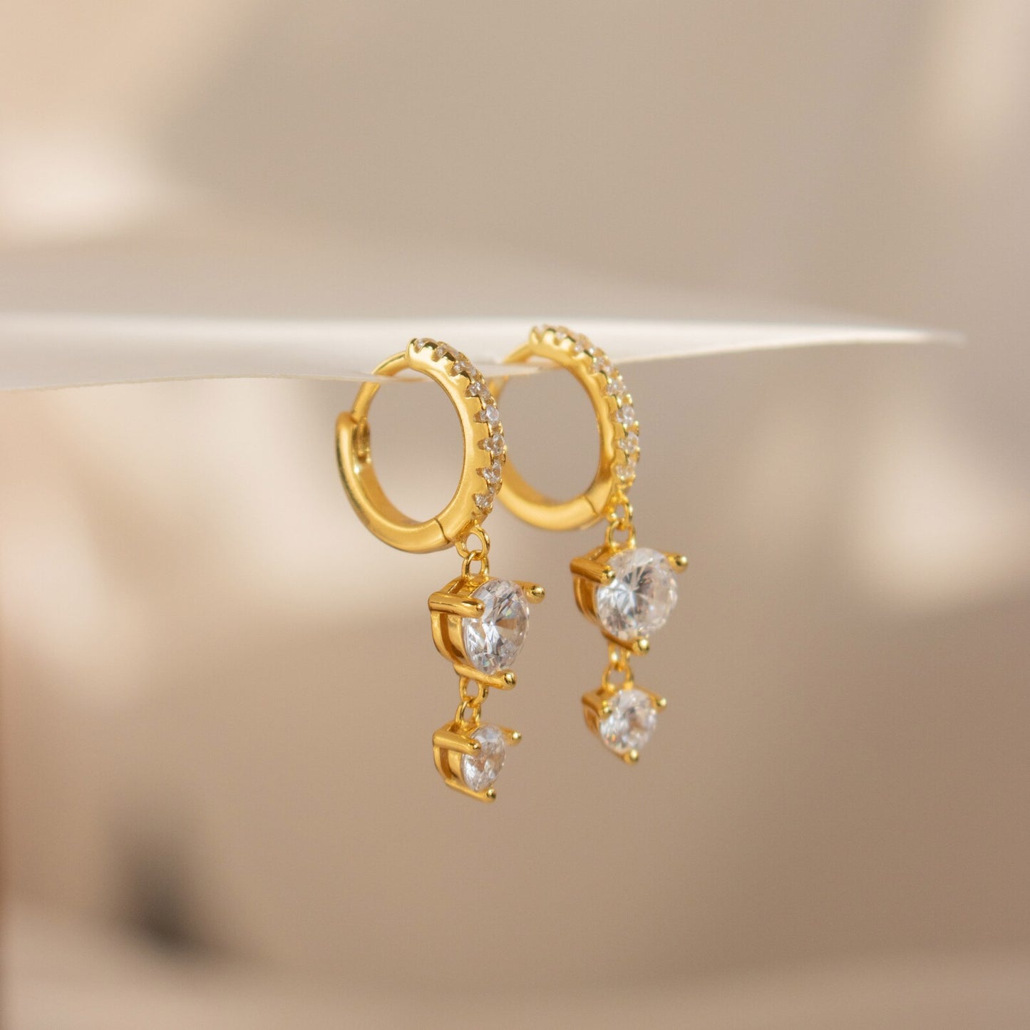 • Featuring 8mm Pave Huggie Hoops with dangling 5mm and 3mm CZ Diamonds
