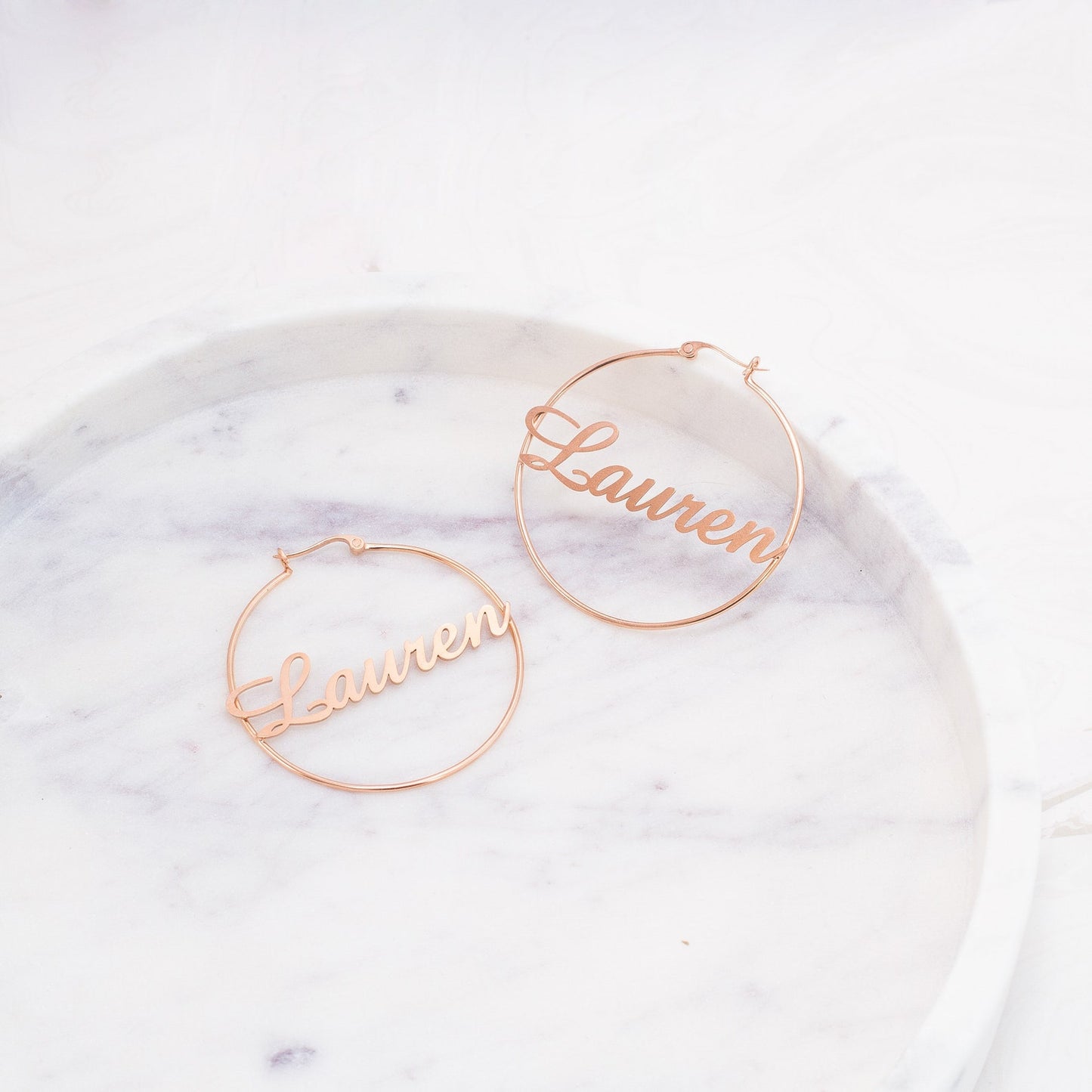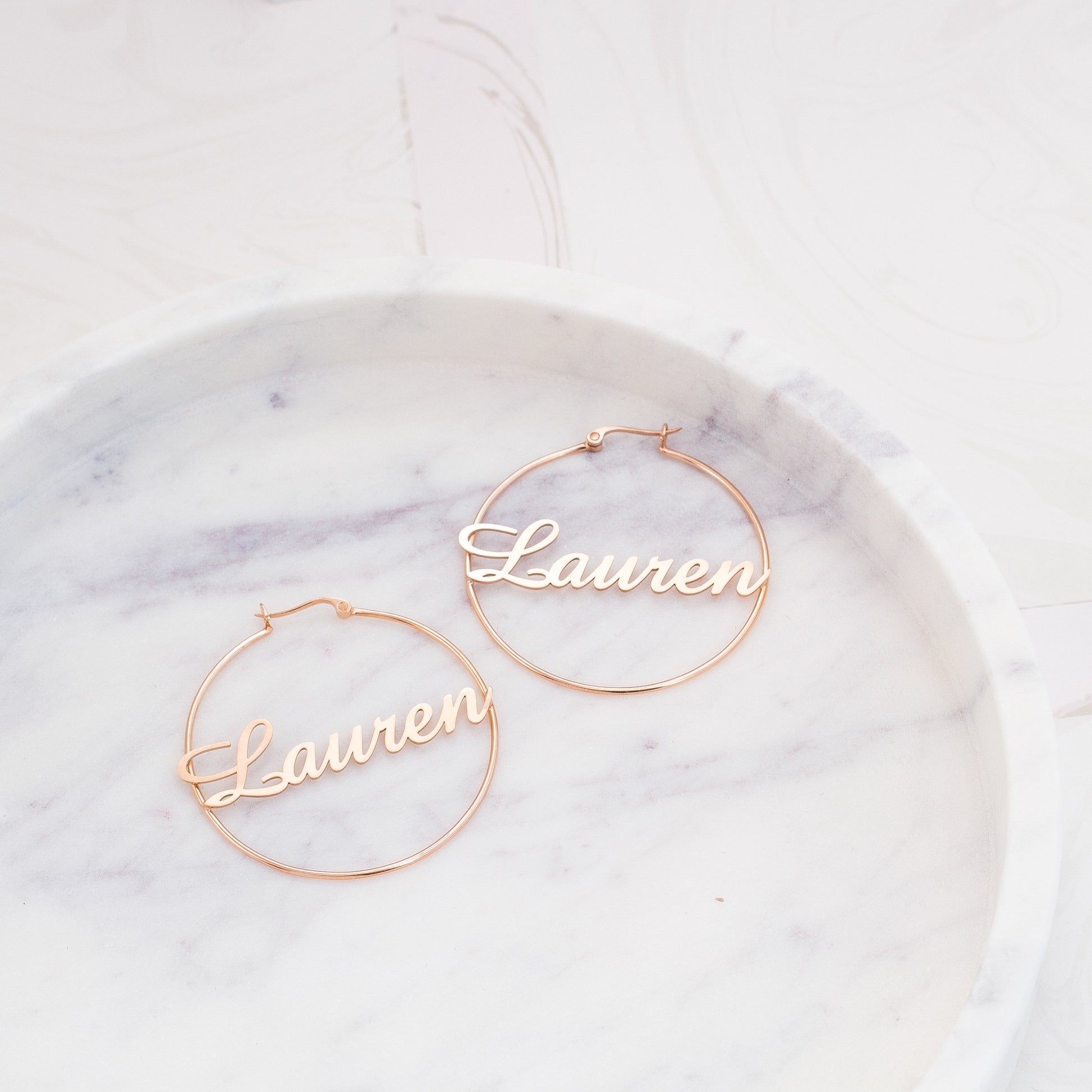 Classic Name Hoops featuring "Lauren" in cursive gold, displayed on a white cube. Perfect personalized jewelry for fans of stylish name earrings.