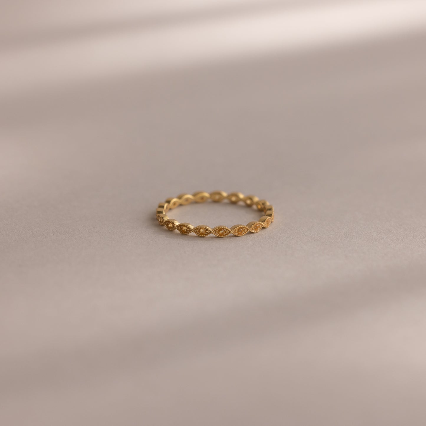 The Dainty Marquise Topaz Ring, featuring a repeating marquise pattern, rests on a smooth, neutral surface with soft shadows.