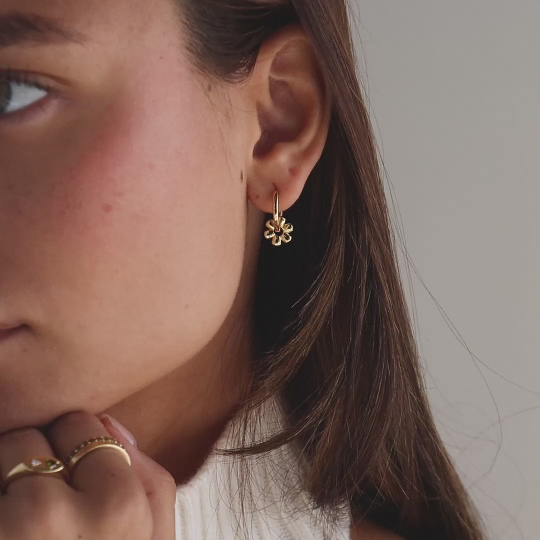 • Featuring a ~1.5mm wide Huggie Hoops with dangling ~9mm Flower Charm