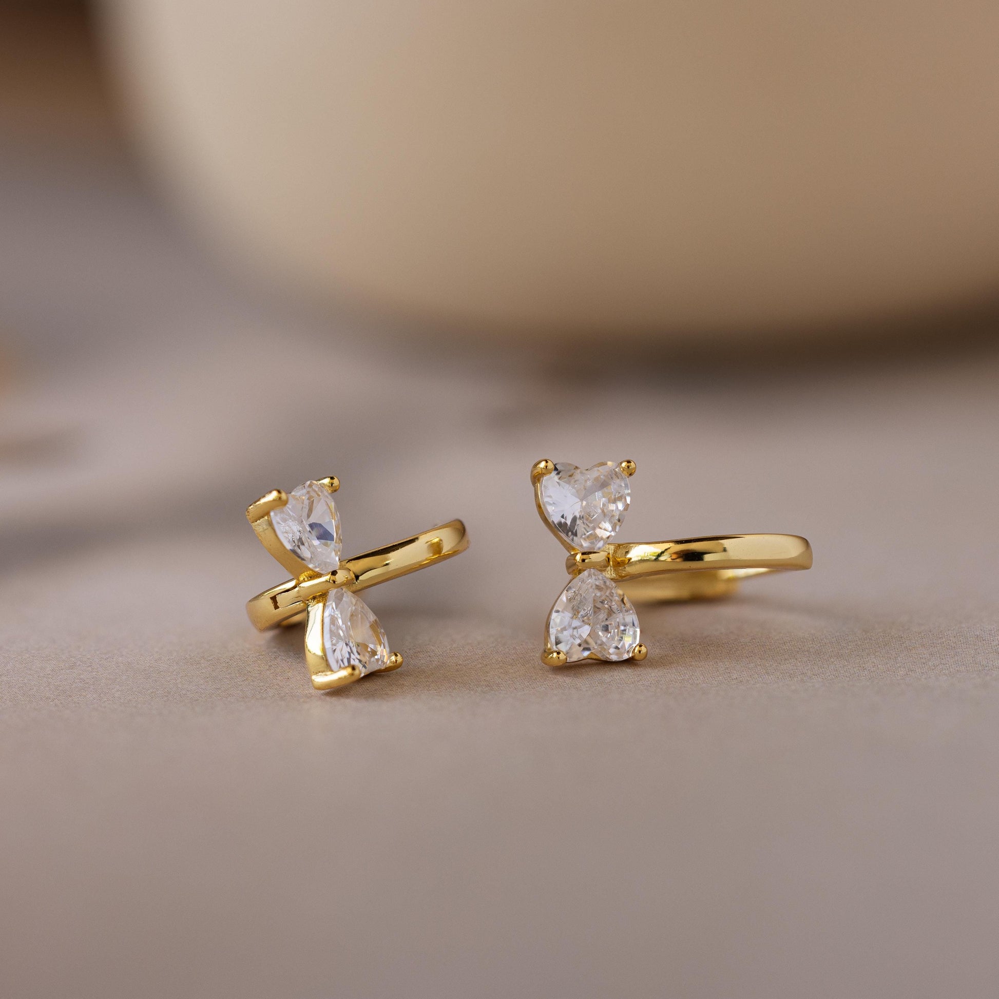 Diamond Bow Huggies, gold hoop earrings inspired by delicate bowties and adorned with sparkling gemstones, displayed on a crumpled beige background.