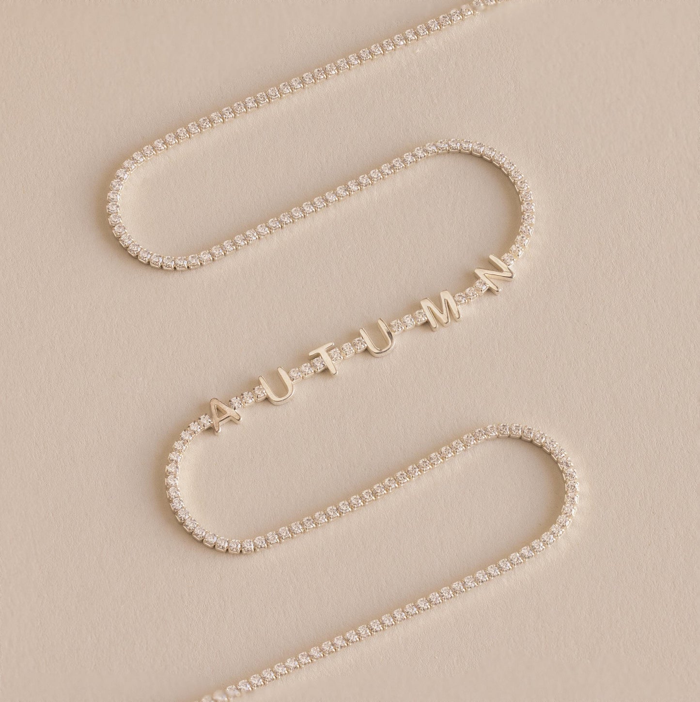 Get ready to shine with our Diamond Tennis Letter Necklace, featuring custom letter charms spaced along a timeless tennis chain. Perfect for spelling out your name, a loved one’s, or a word that inspires you, this necklace is as meaningful as it is glamorous ✨