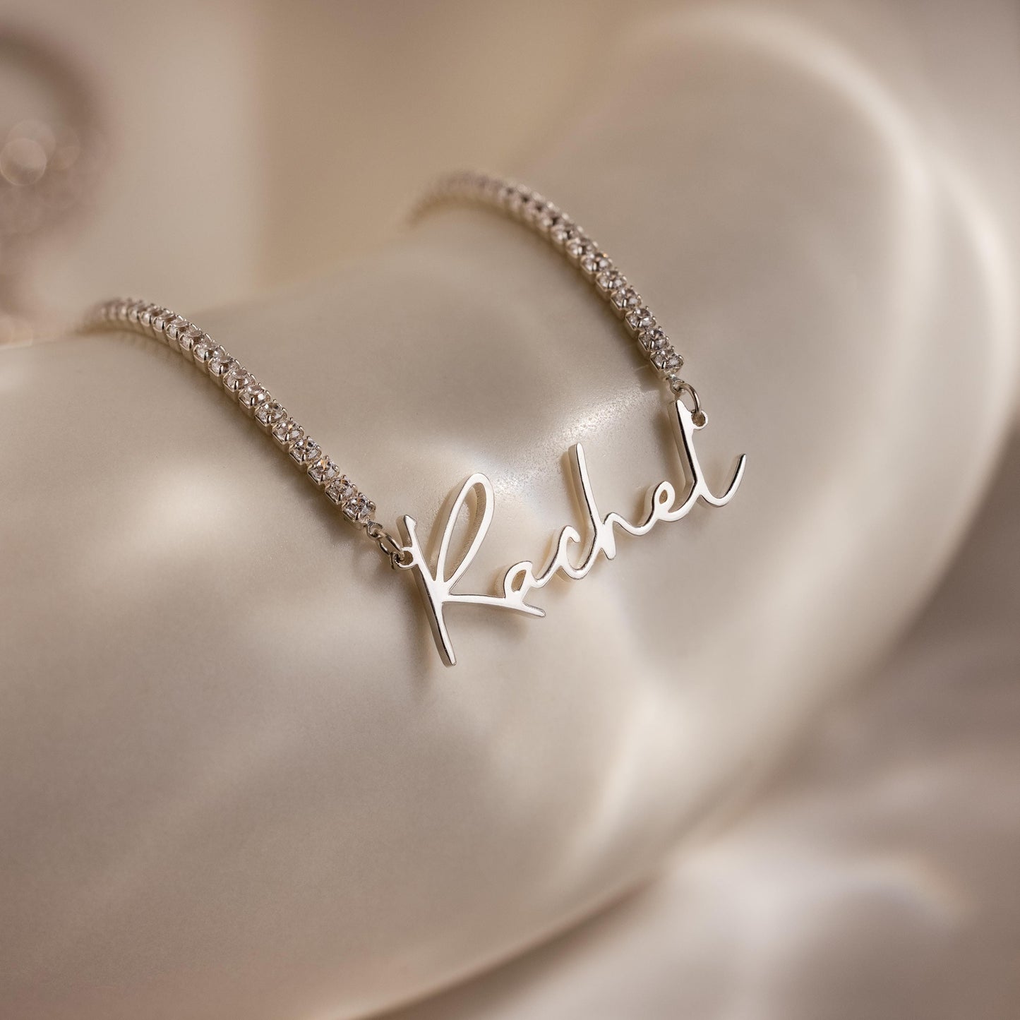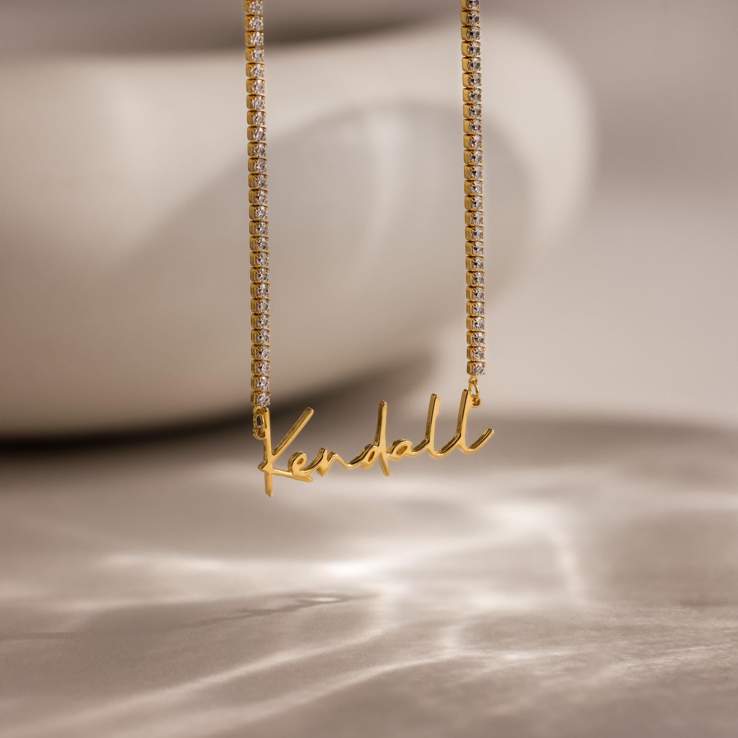 Personal meets polished with our Diamond Tennis Name Necklace! Featuring a custom nameplate charm set along a timeless tennis chain, this necklace is perfect for adding a touch of luxury to your everyday. Dressed up or down, it’s made to shine wherever you go ✨