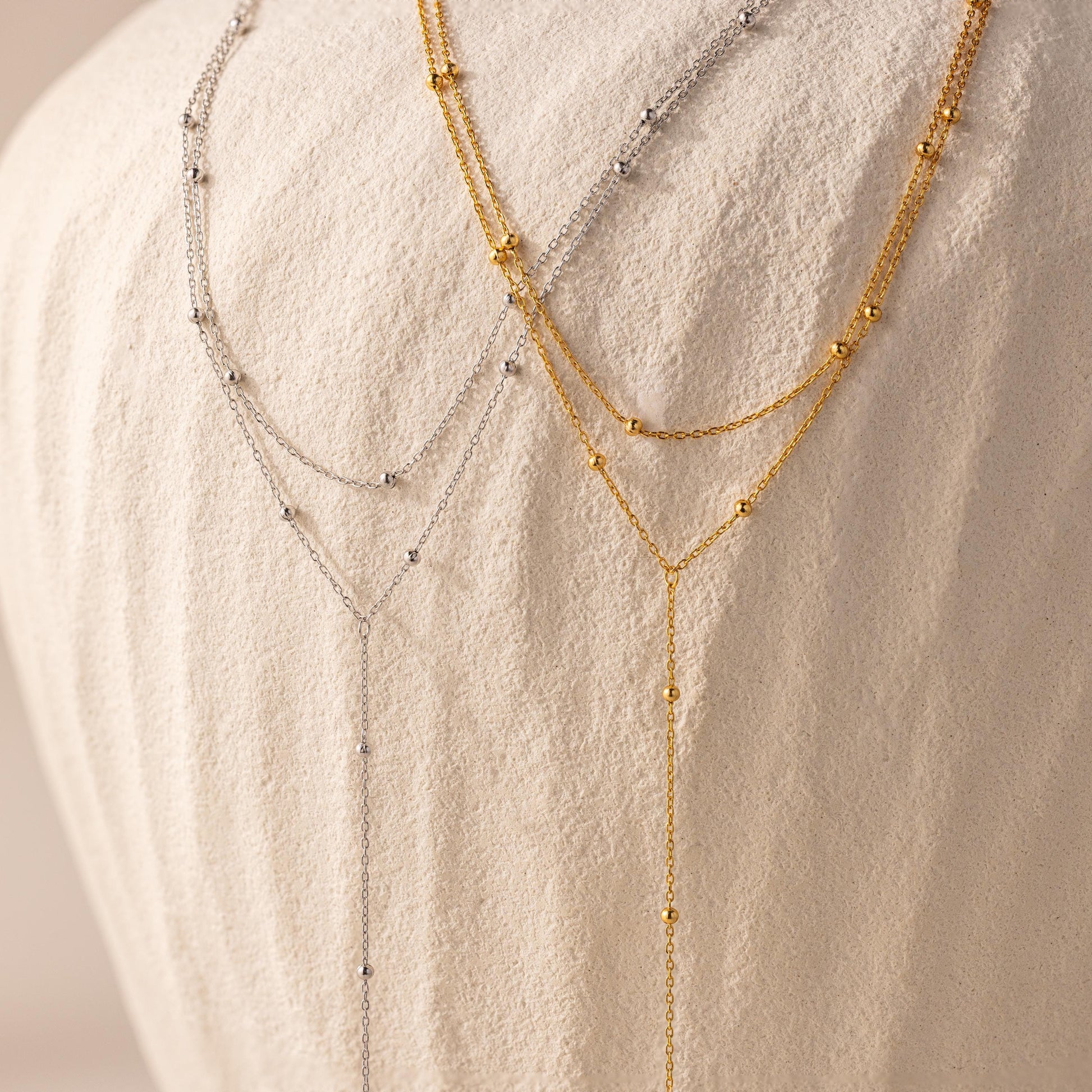 Close-up of the necklace’s gold satellite bead chain against a textured cream background.