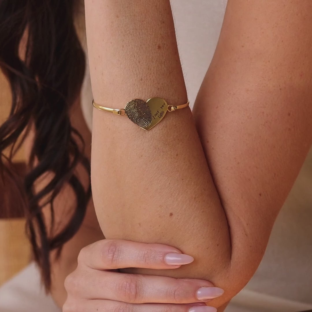 The Fingerprint Heart Bangle features an engraved fingerprint and "Love you, Dad" on a heart charm—perfect personalized jewelry for women.