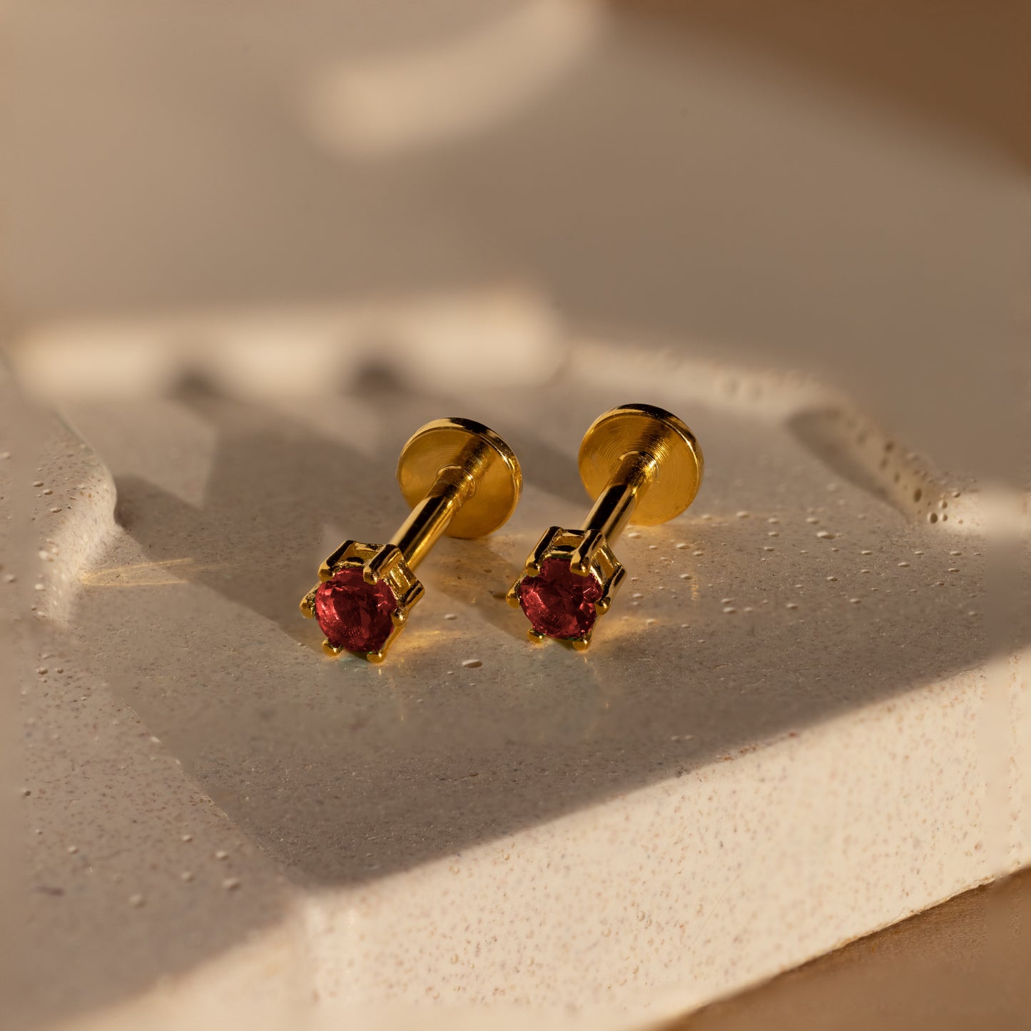 Twelve dainty earrings, including Garnet Flatback Studs in various colors, are arranged in a grid on a beige background.