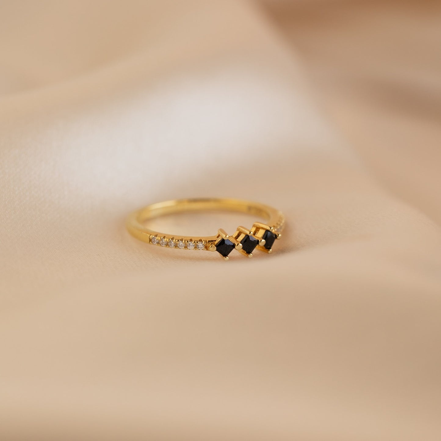 The Helena Black Diamond Ring is a delicate vintage gold ring with three black square stones and small clear gems on the band, set against a beige background for an edgy, professional look.