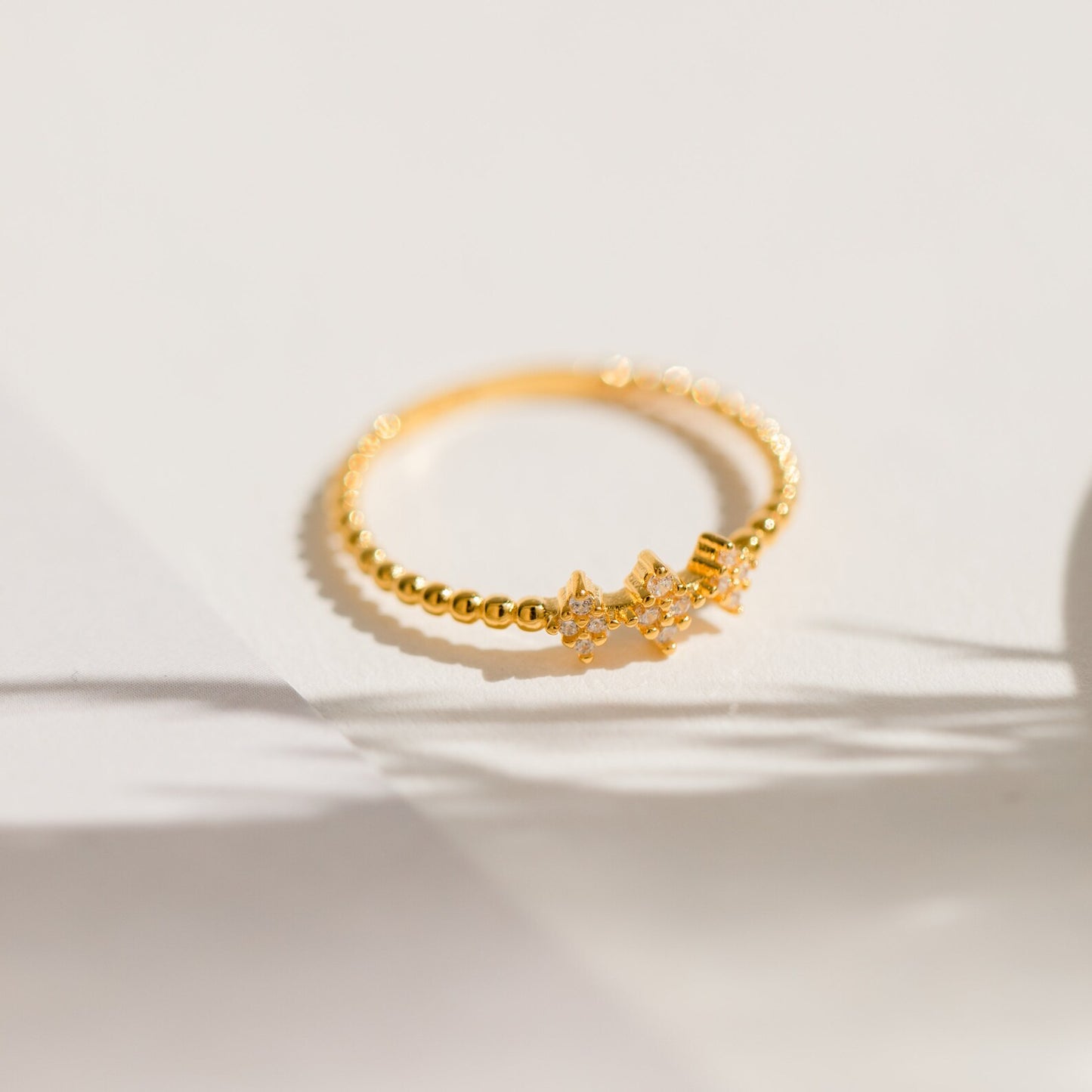 Un anillo de diamantes clásico de inspiración vintage para cada ocasión. Diseñado con una banda de cuentas para agregar textura a su conjunto de anillos y tres dijes pavimentados en forma de diamante porque, a veces, más es más.