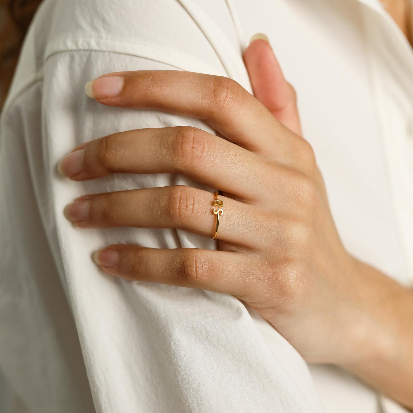 A hand adorned with the Modern Duo Initial Ring, showcasing gold initials A and B, rests elegantly on a white shirt.