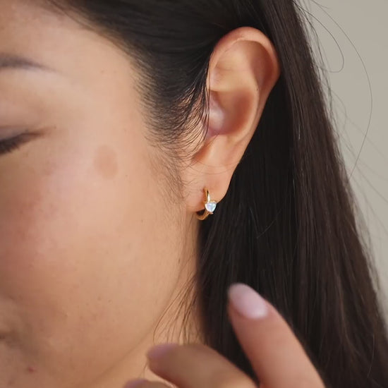 • Con aretes tipo argolla Huggie de ~1,5 mm de ancho con una piedra preciosa de corazón de circonita lunar de ~4 mm