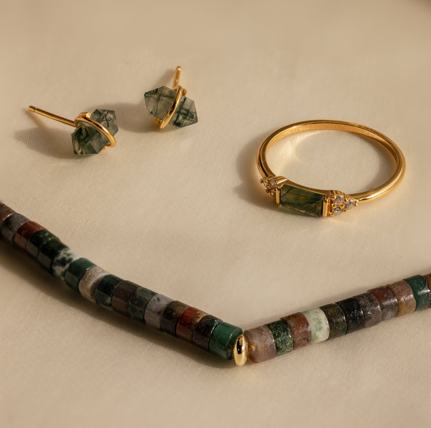 - Con un collar de cuentas mixtas de ágata musgo de ~4 mm en una cadena ajustable de 16 a 18 pulgadas
