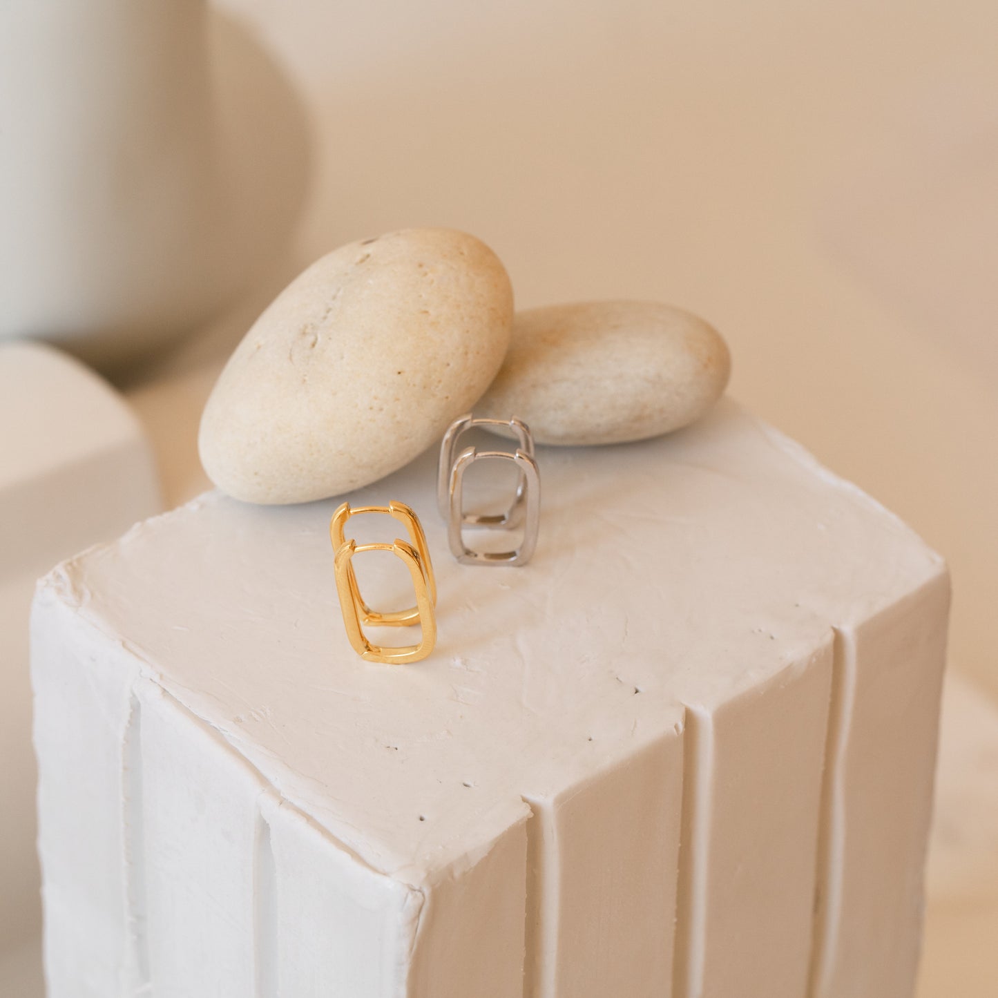 Nina Link Earrings, featuring sleek rectangular gold huggies, are displayed on a white textured surface with a soft, neutral background.