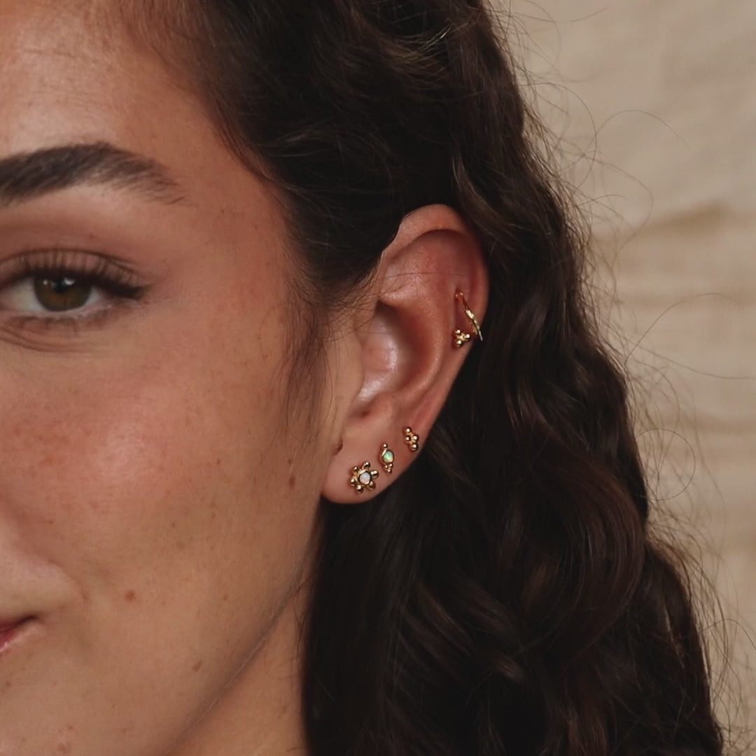 Presentamos nuestros Opal Cartilage Huggies: un accesorio elegante y moderno diseñado para quienes aprecian la simplicidad con un toque de elegancia. Con siete piedras preciosas con puntos de ópalo delicadamente incrustadas en un aro, esta pieza es perfecta para perforaciones de hélice o cartílago ♡ Ideal para cualquier ocasión, es el arete minimalista que estabas buscando.