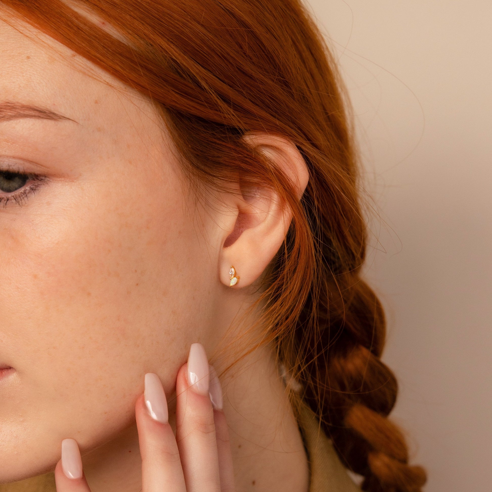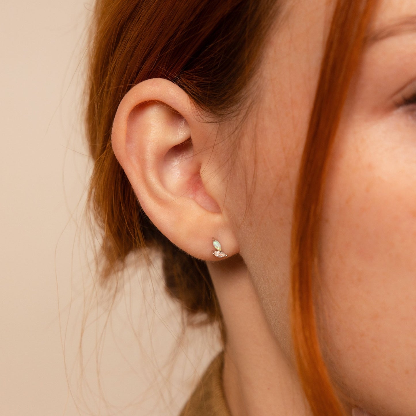 El modelo muestra una apariencia discreta y delicada con nuestros pendientes Opal Marquise .