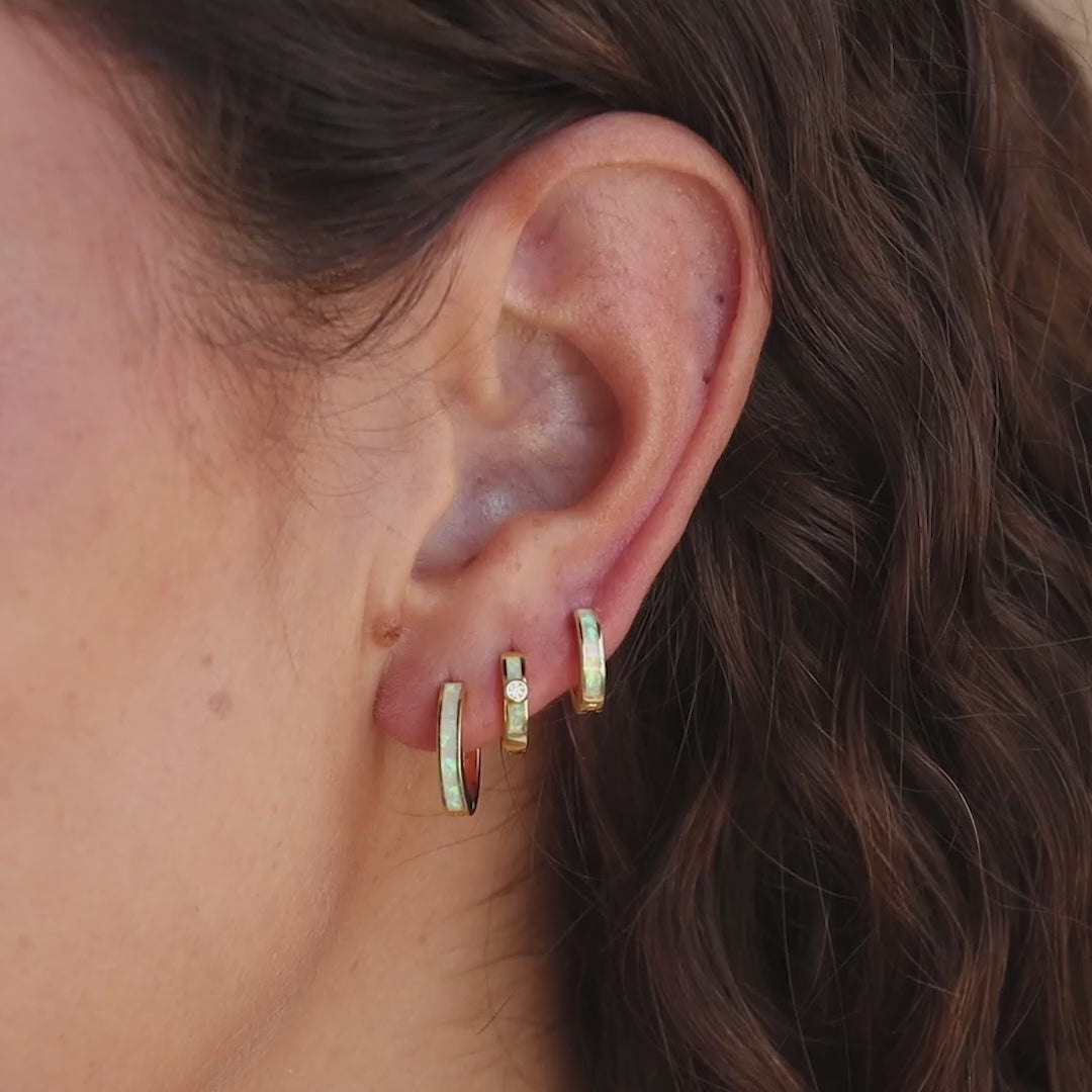 Surprise someone special with our Opal Inlay Diamond Huggies, featuring dainty gold hoop earrings with stunning Opal Inlay and a sparkling Diamond stone at the center. These elegant earrings are the perfect gift to add a touch of luxury and charm to anyone's jewelry collection.