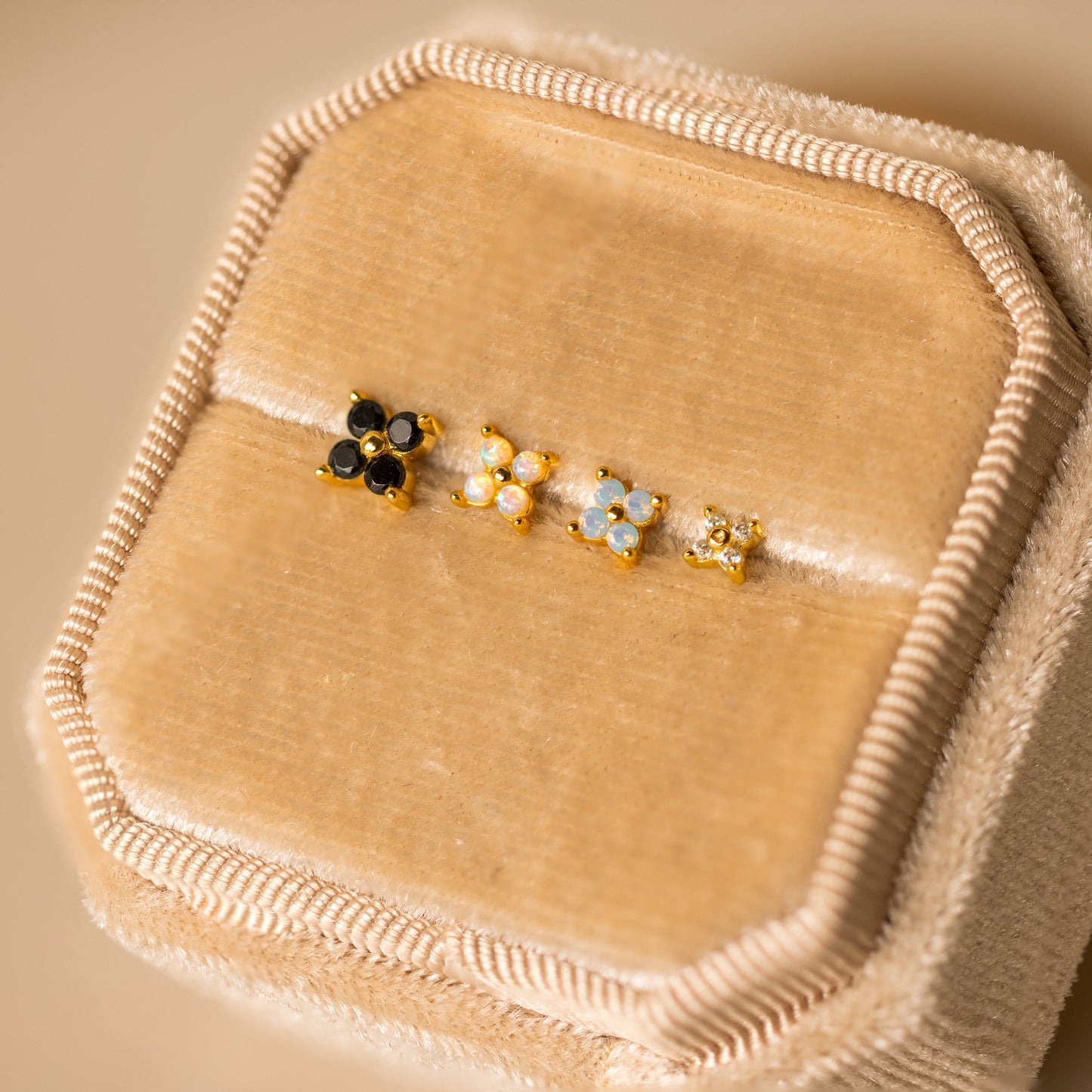 The Opal Ivy Flower Studs feature small gold flowers with four opal-like stones, displayed on soft cream fabric. These delicate earrings are a meaningful gift for any occasion.