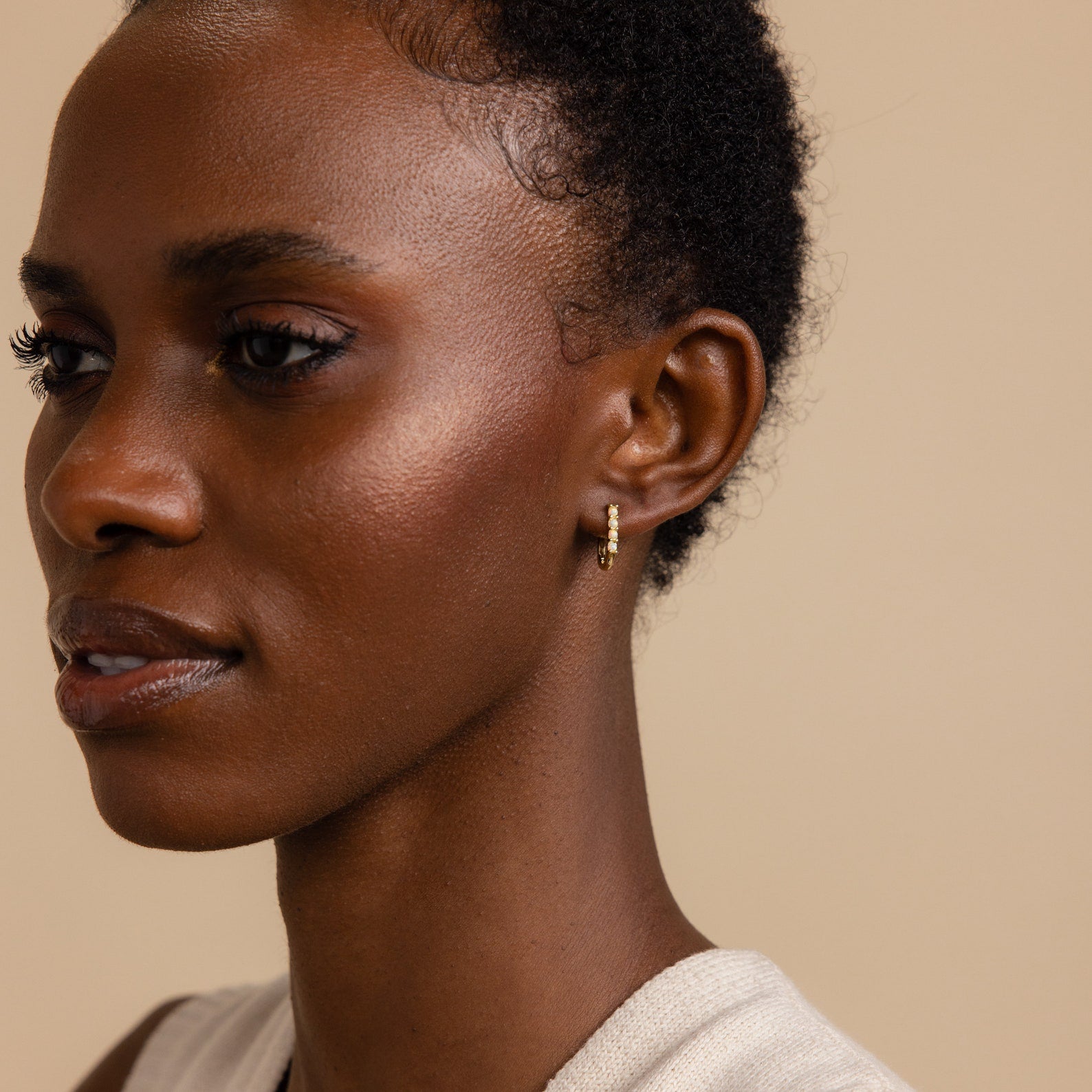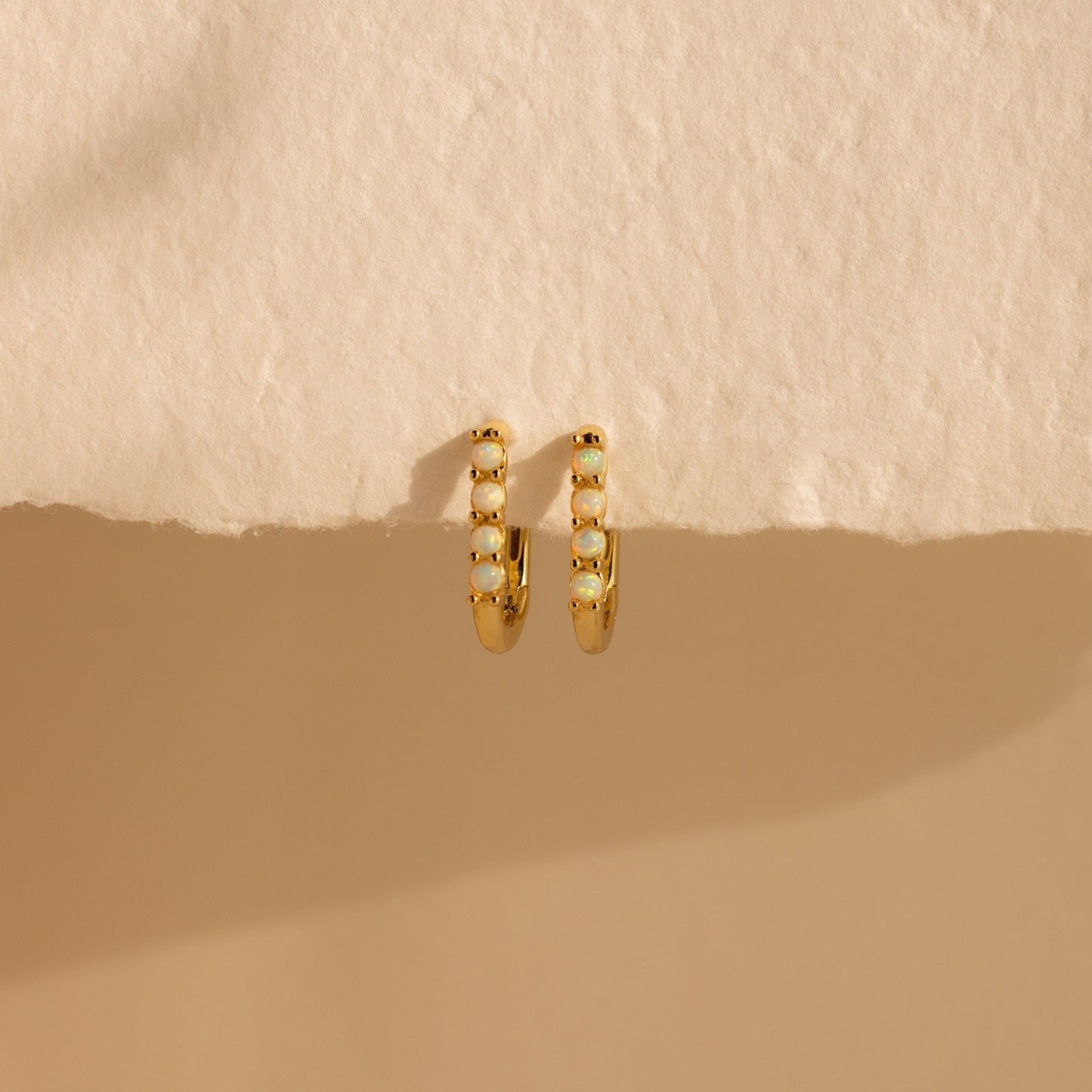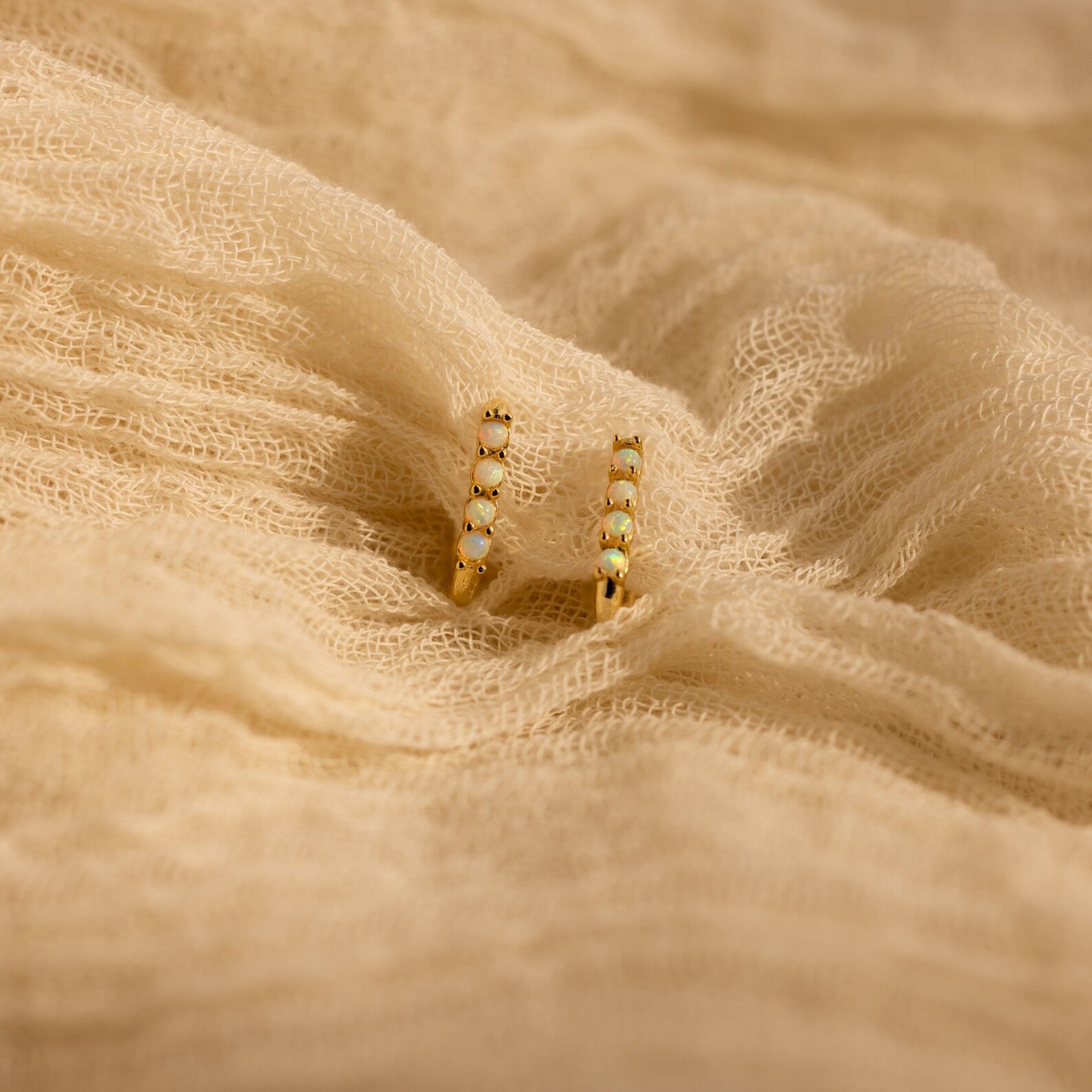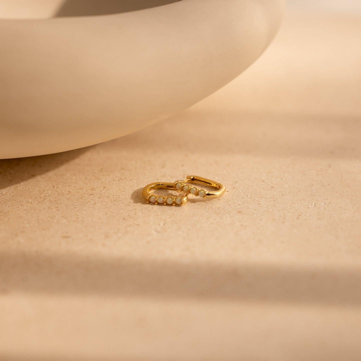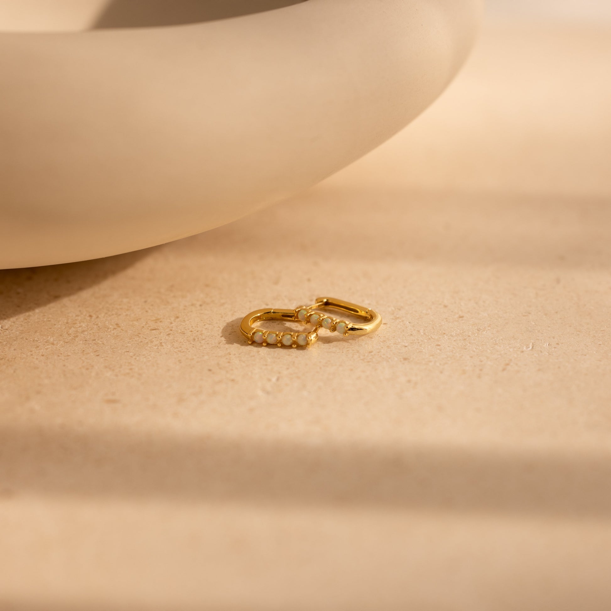 Opal Link Hoops—gold hoops adorned with small white stones, echoing the look of delicate opal earrings—are shown on a textured beige surface with soft shadow.