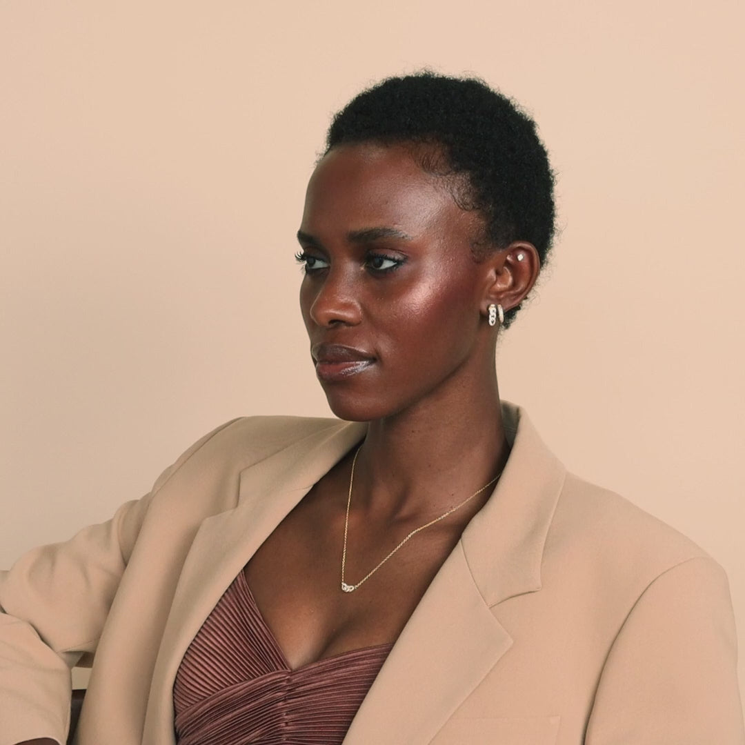 El modelo muestra un estilo cotidiano clásico y elegante con nuestros Kira Pave Huggies y Avery Geométrico Diamond Studs .