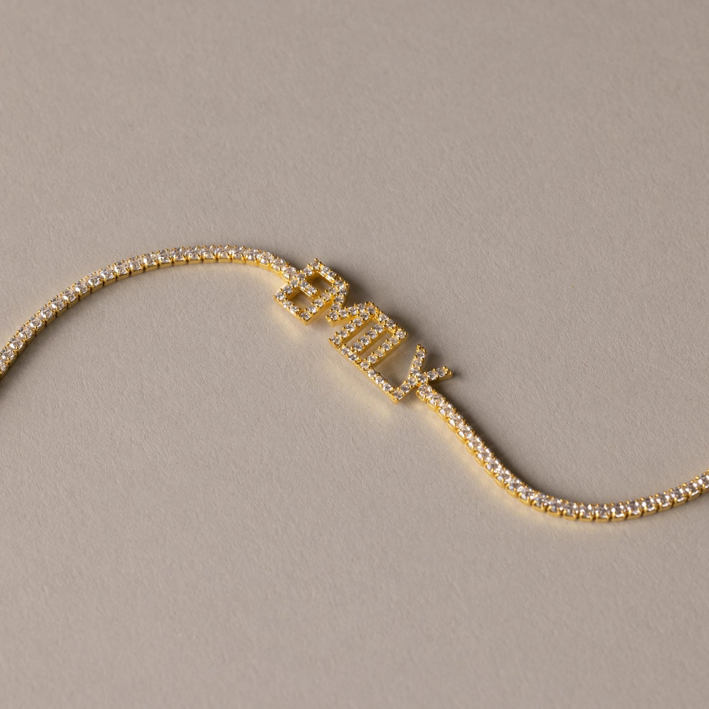 Create a piece that shines as bright as you with our Pavé Name Tennis Bracelet! Designed with shimmering pave letters and a sleek diamond chain, this bracelet turns your name into an eye-catching statement ✨