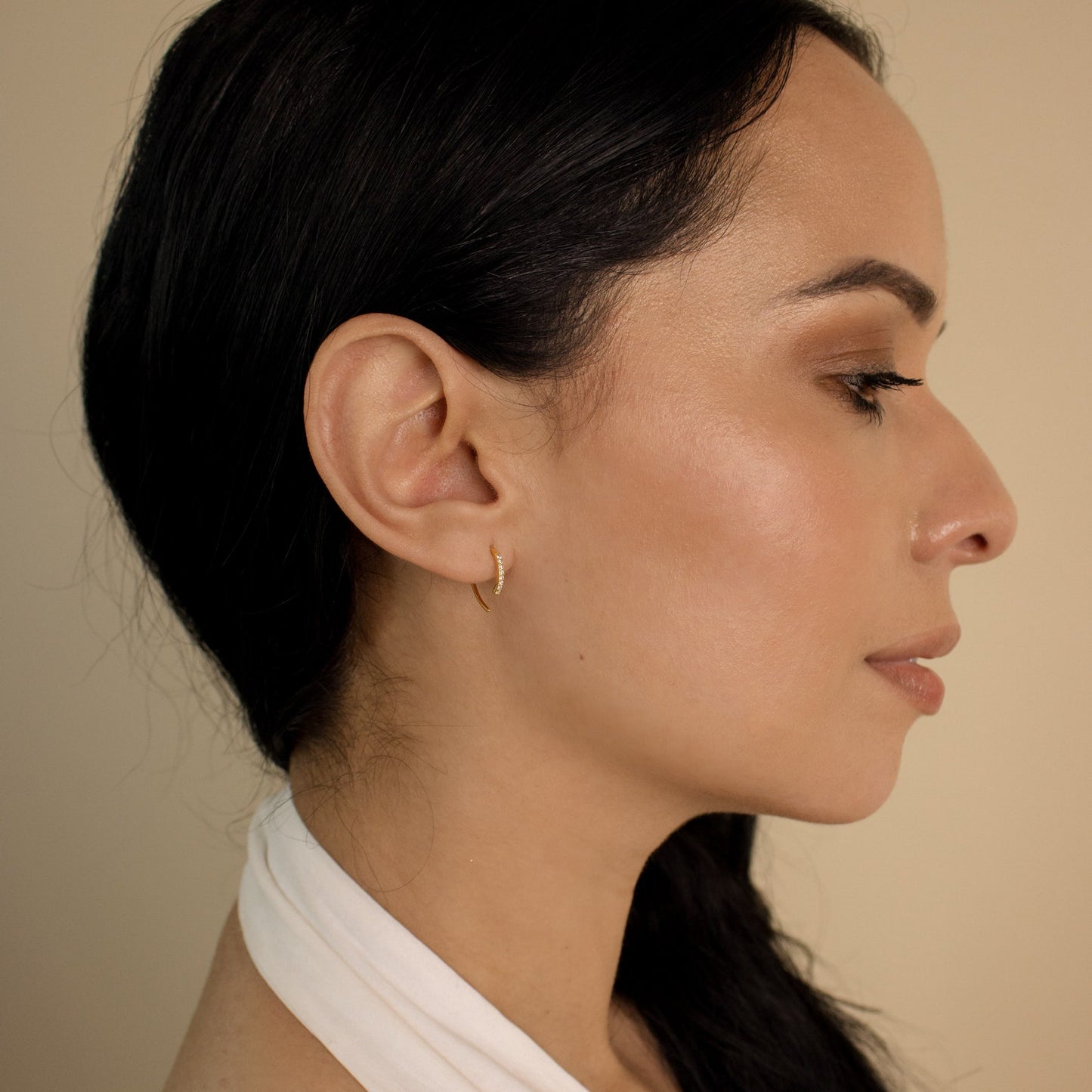 Woman with long dark hair, shown in profile, wearing Pave Wire Diamond Hoops in her left ear.