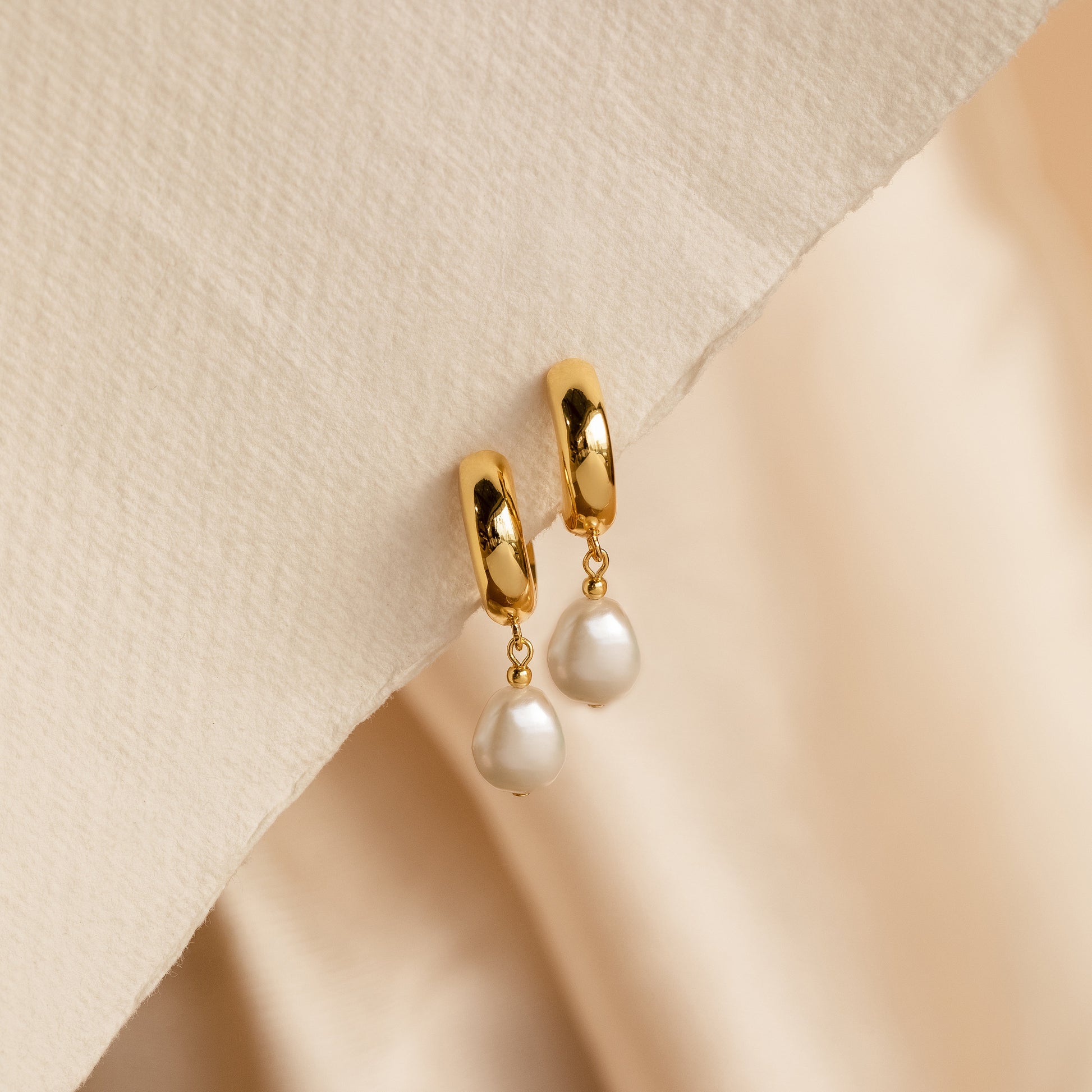 • Featuring ~9x7mm dangling Round Pearl Charm on Huggie Hoop Earrings