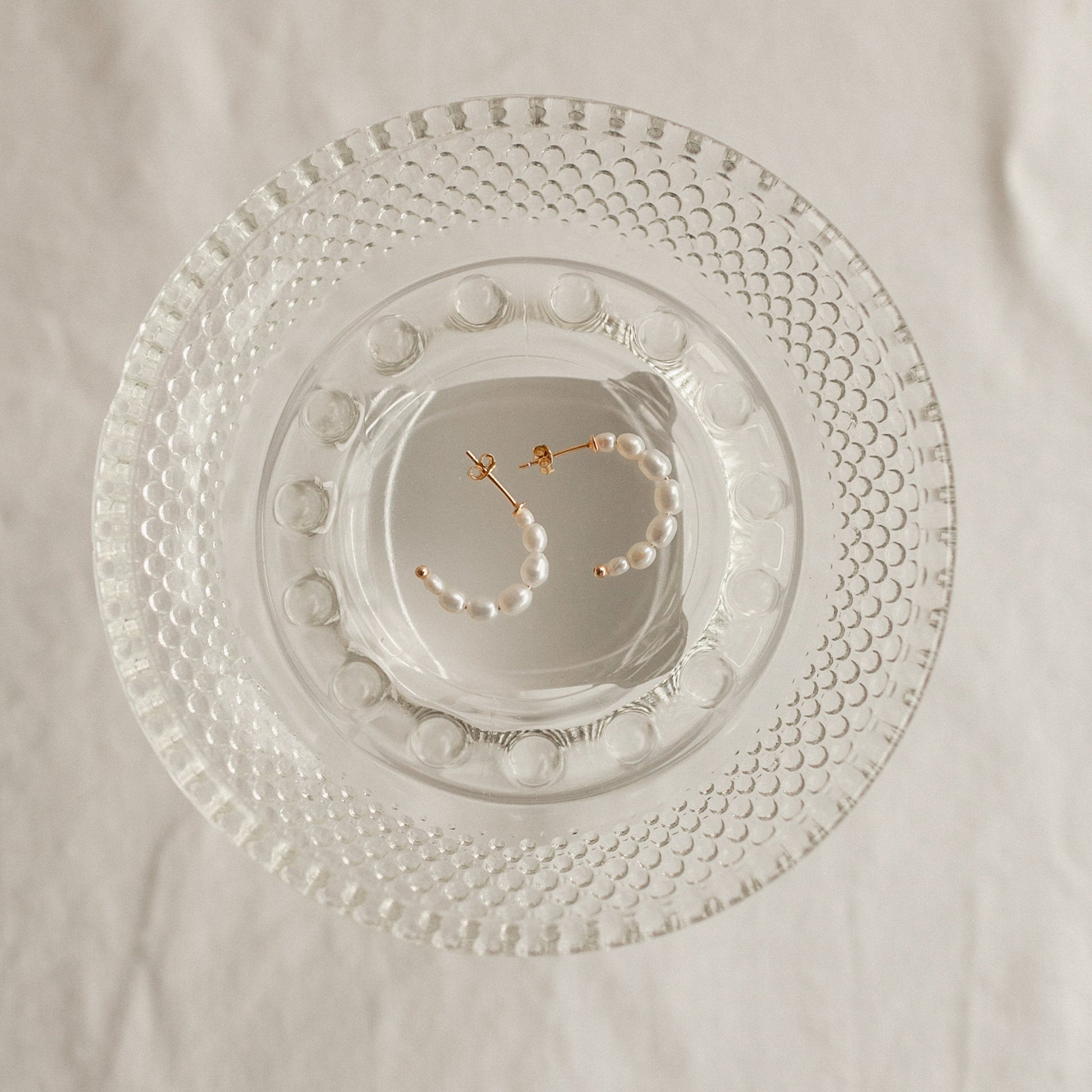 Pearl Hoops are displayed on a clear textured glass plate, highlighting these earrings as an elegant everyday accessory.