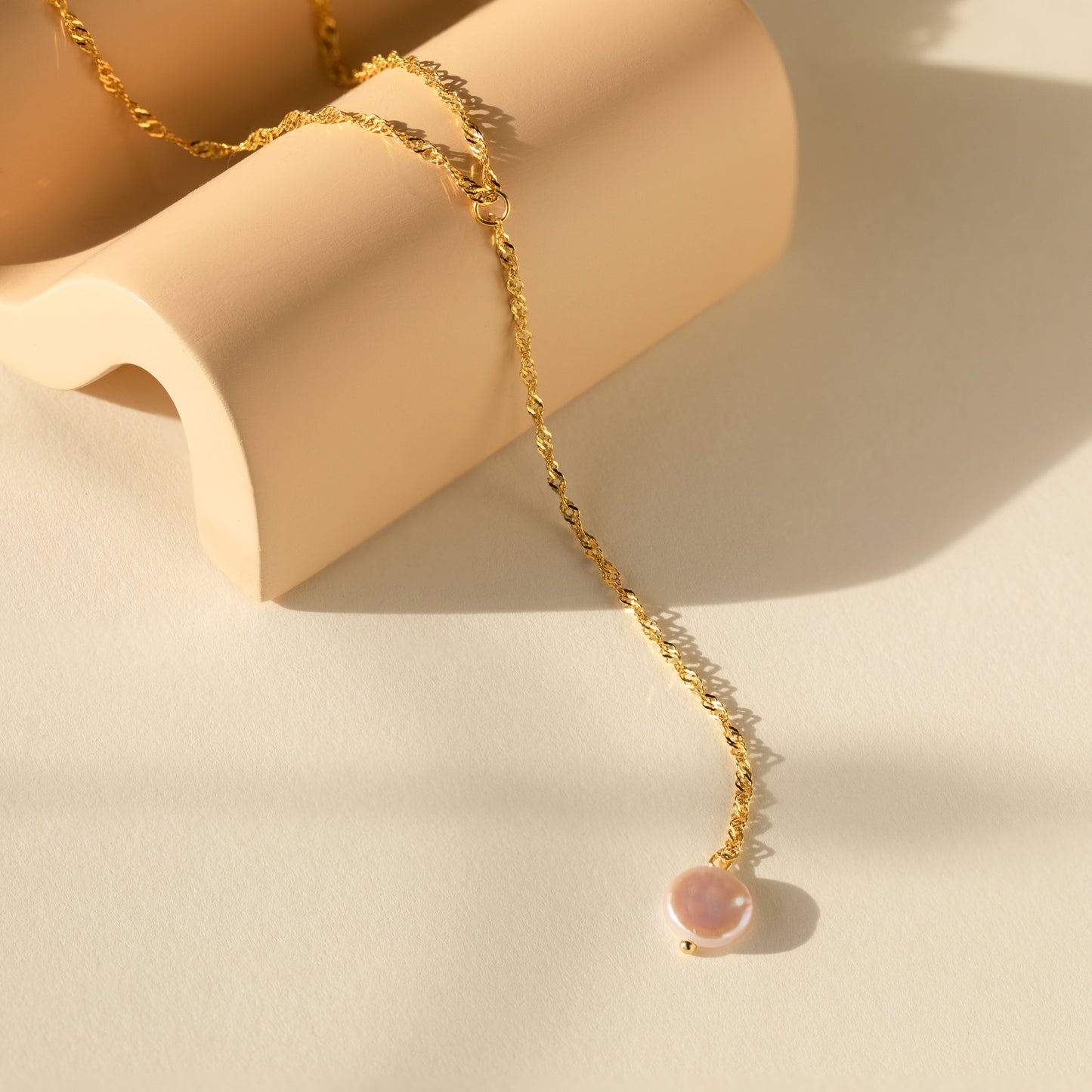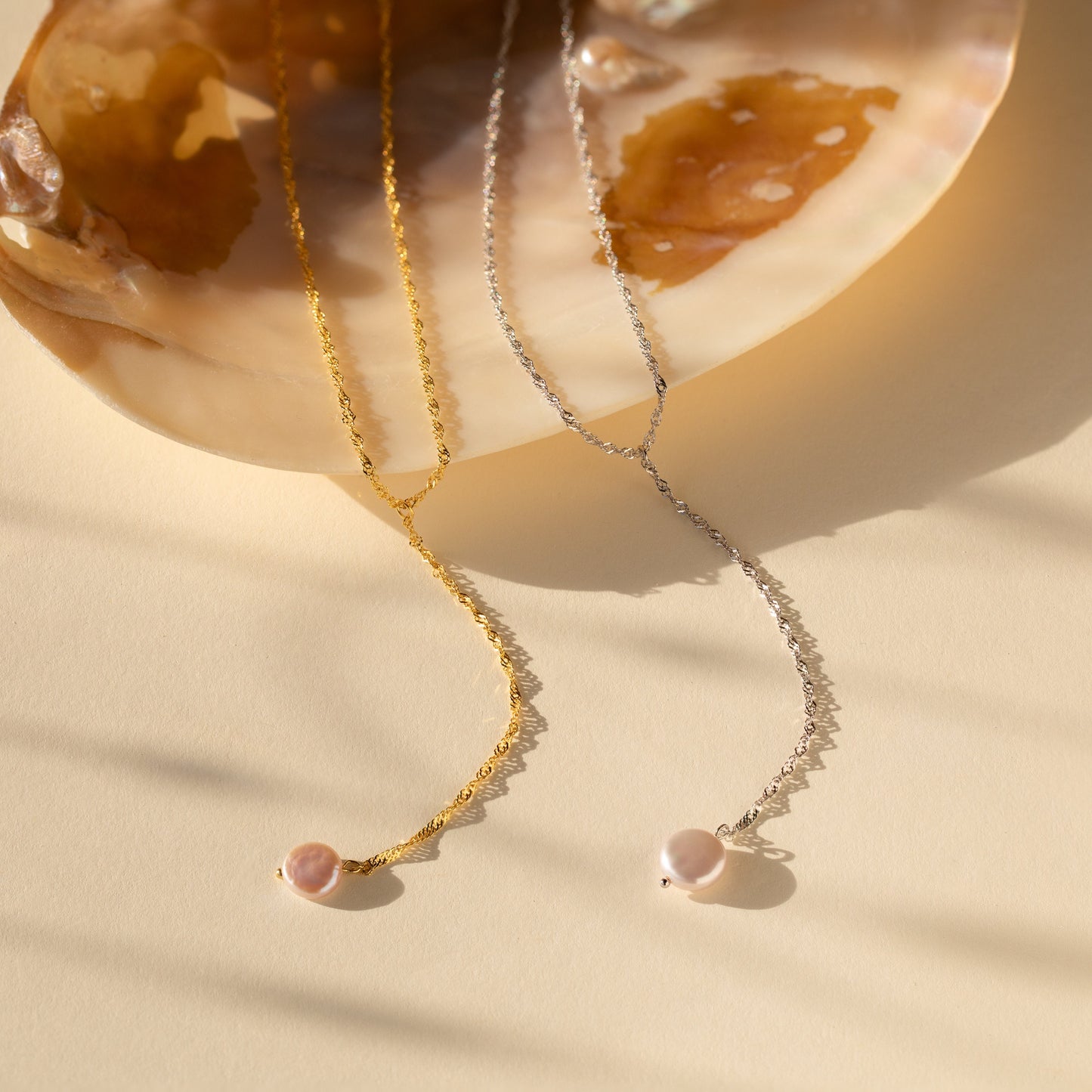 - Con un dije de perla de ~9 mm en un collar de cadena Lariat Singapore Twist de ~3 pulgadas de largo, ajustable de 16 a 18 pulgadas