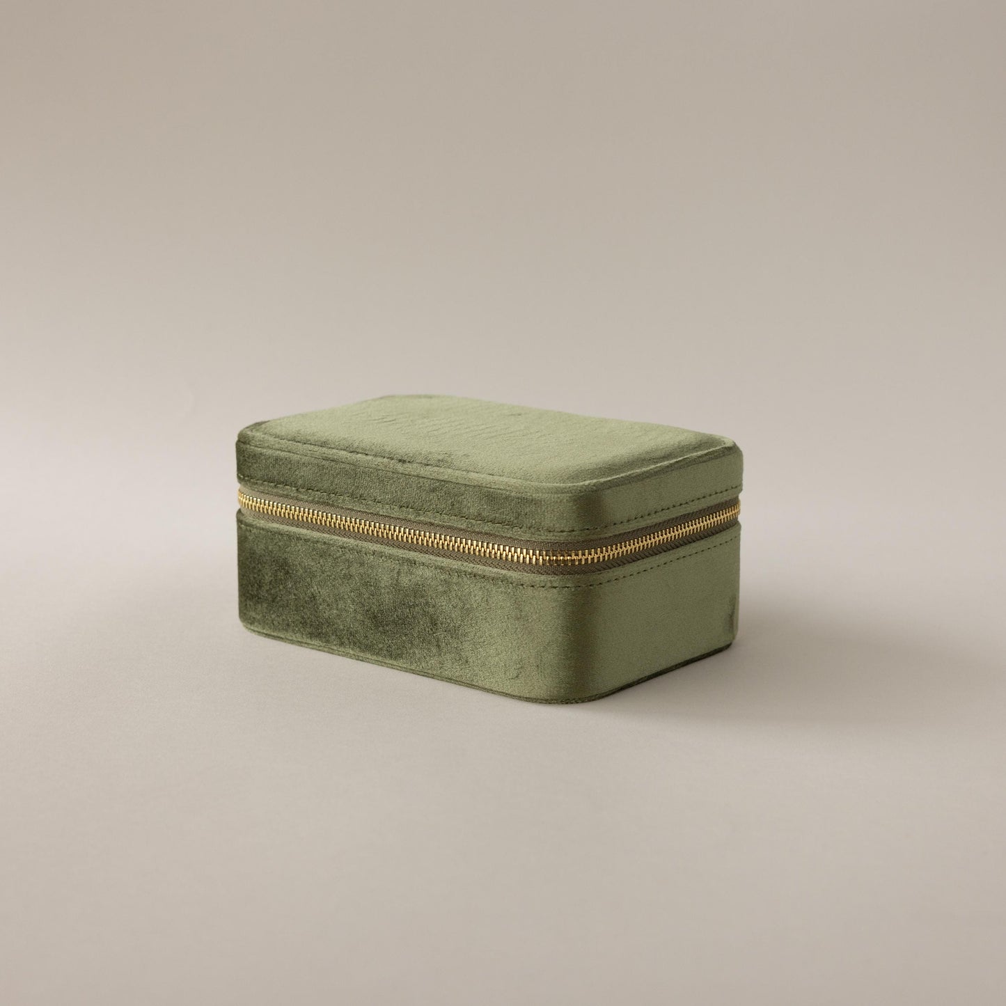 The Rectangle Velvet Jewelry Box in olive green features compartments, ring slots, and earring holders inside its open rectangular design.
