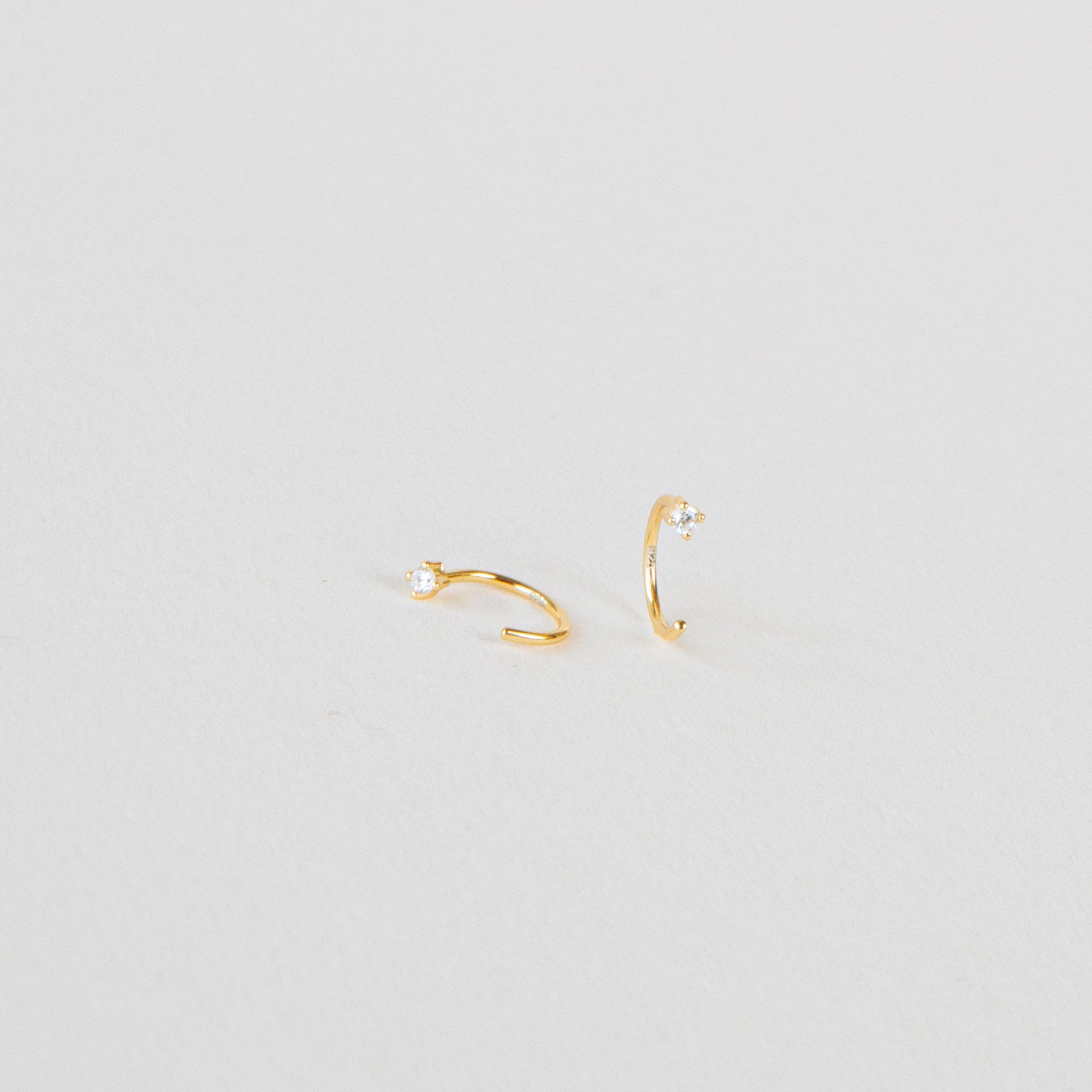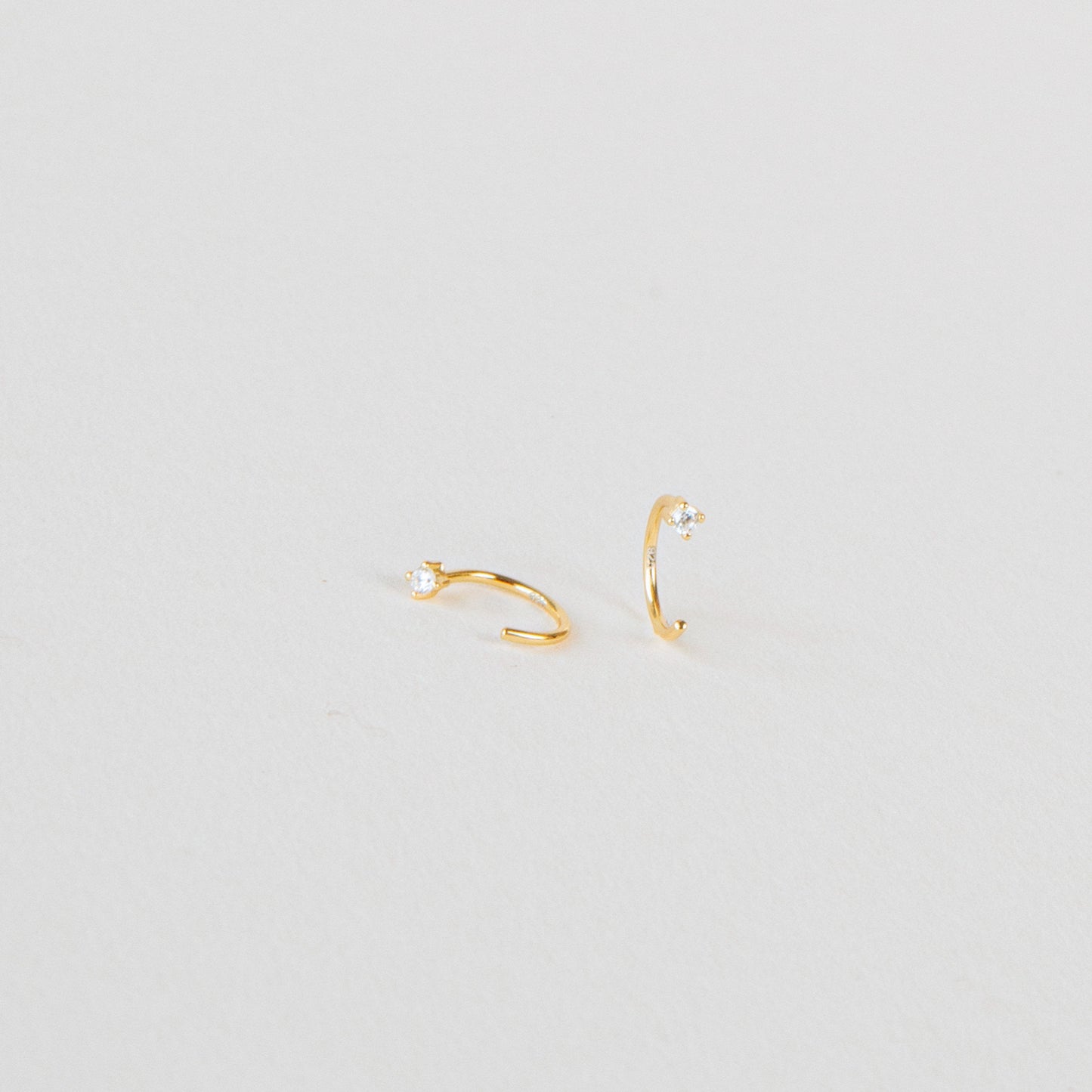 The Saylor Huggies are two small gold hoop nose rings adorned with tiny clear gemstones, displayed on a plain white background.