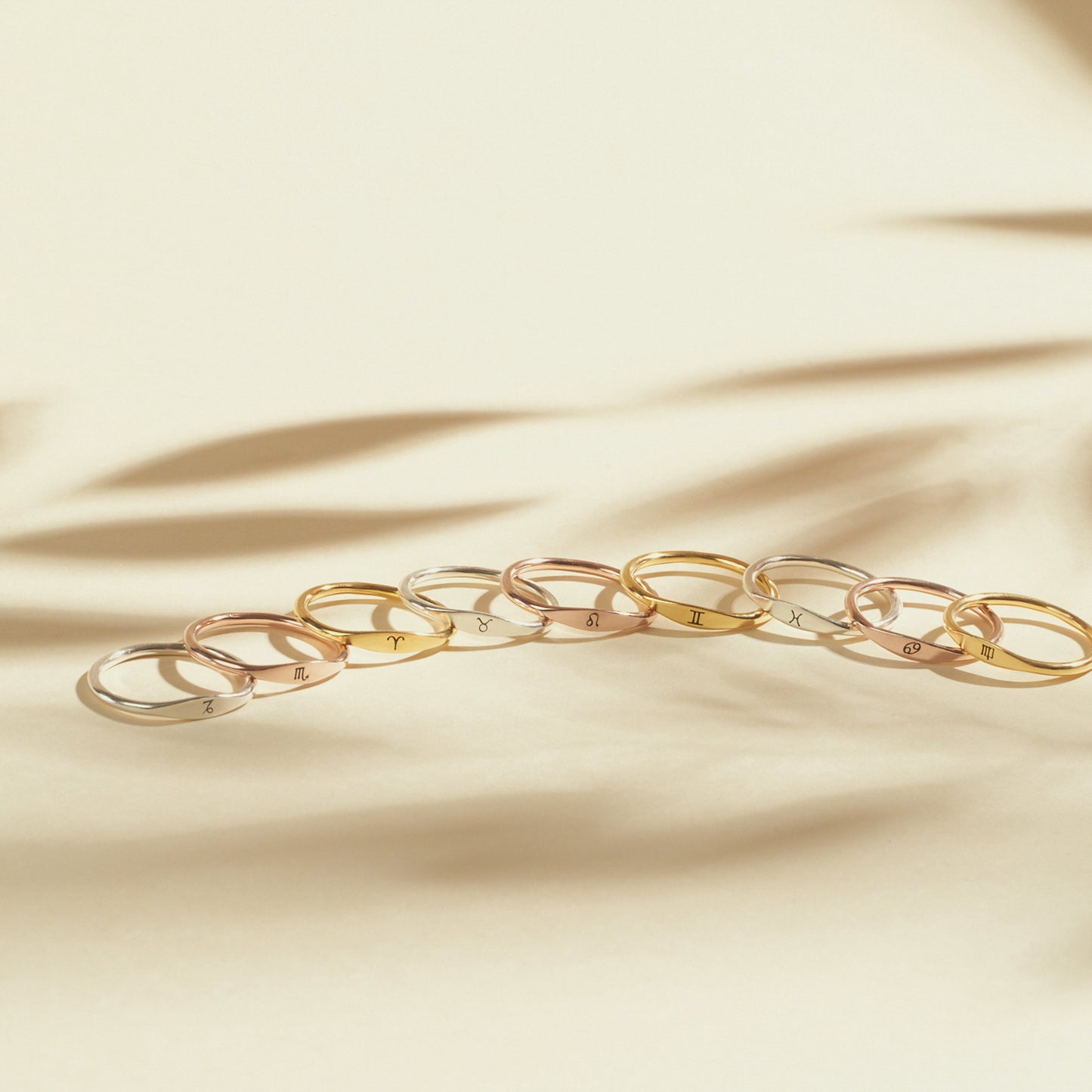 Three Skinny Zodiac Rings with engraved astrological signs rest on a light, neutral background with soft shadows—perfect stacking rings to add a personalized touch.