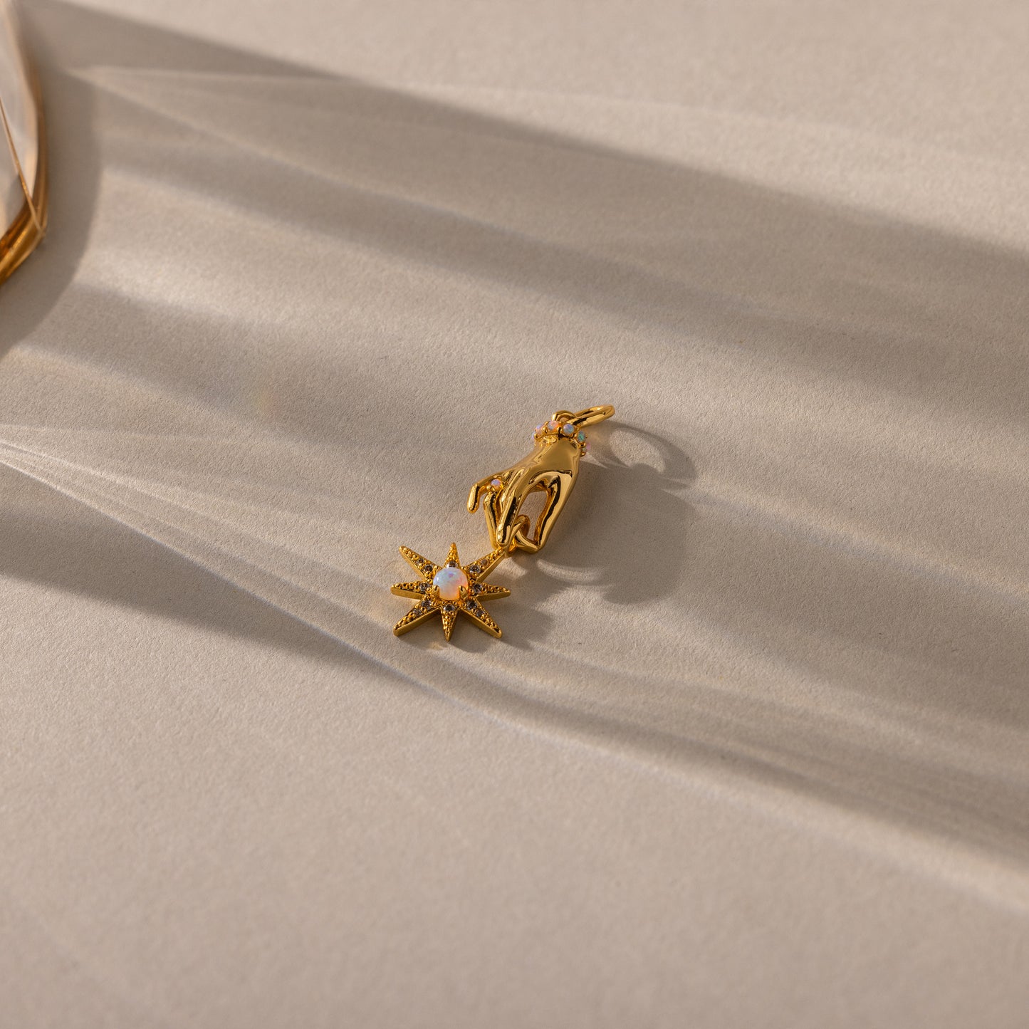 Guided by light, grounded by touch, our Star Opal Hand Charm is a symbol of intuition, direction, and cosmic connection. Featuring a delicate hand reaching for a shimmering star, this charm reminds you to follow your inner compass wherever you go 🌟