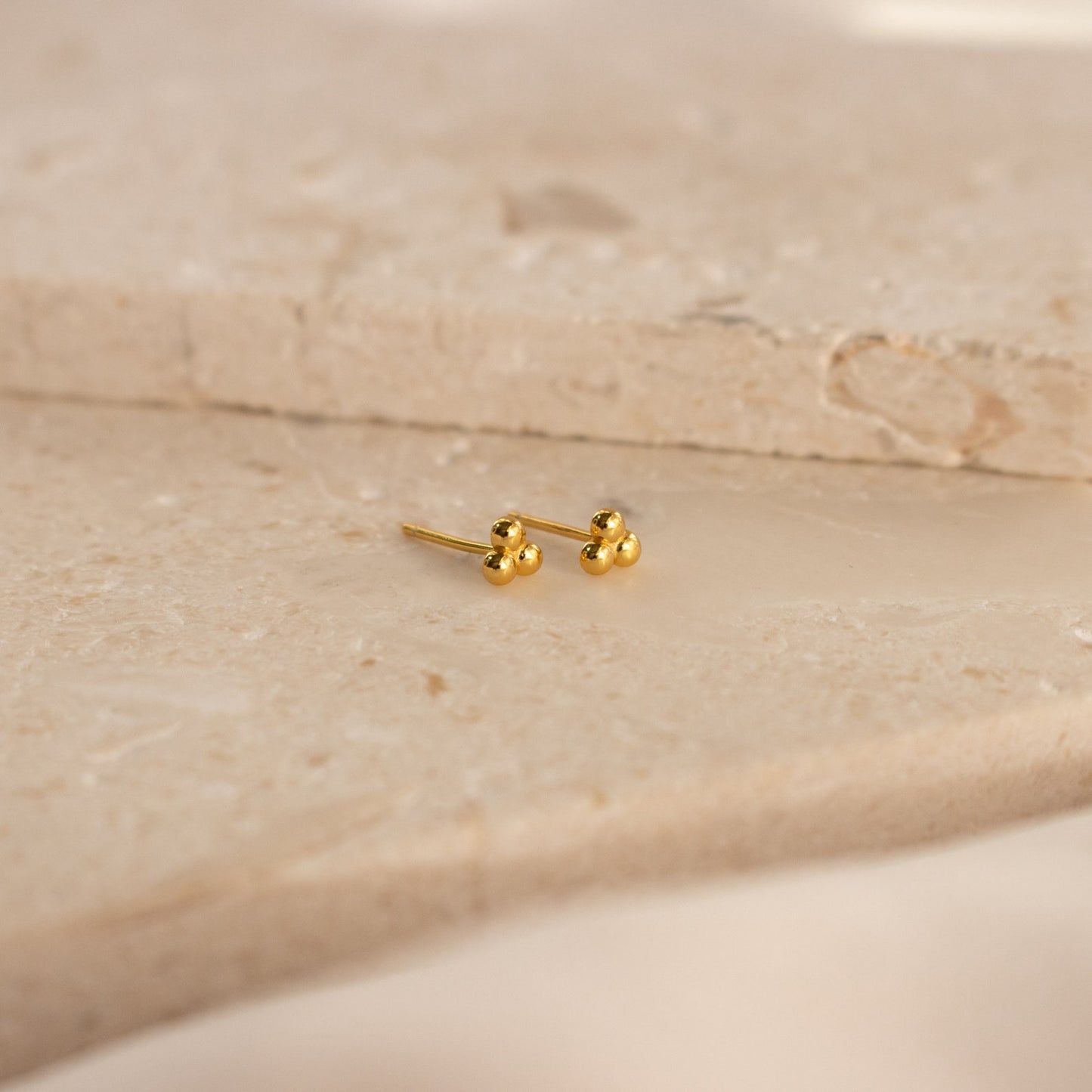 The Trio Sphere Studs feature a small gold three-dot cluster design, displayed on a beige stone surface—ideal for creating an elegant earring stack or accenting alternative piercings.