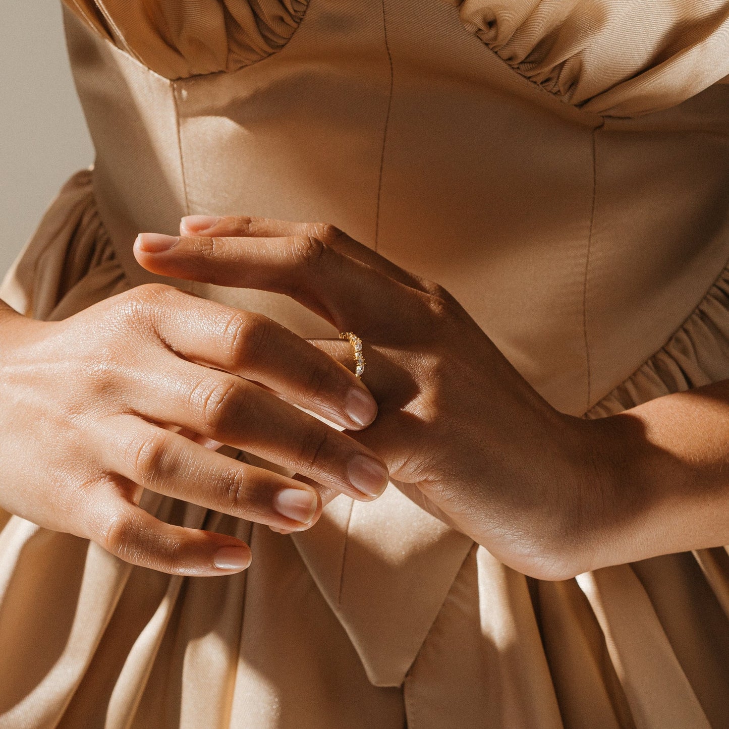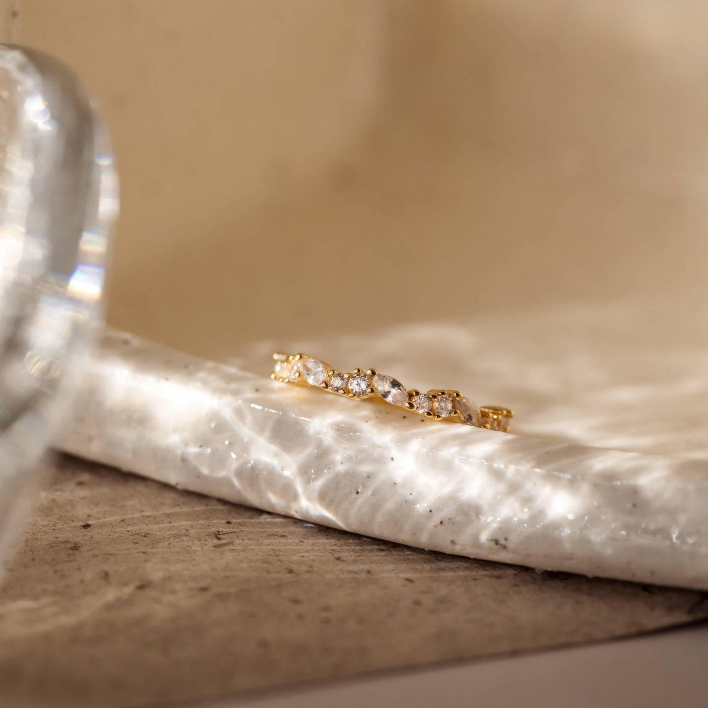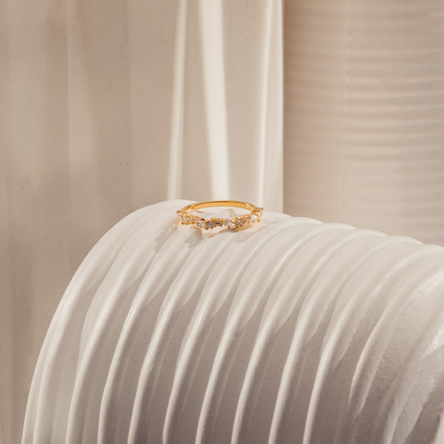 The Verity Diamond Ring, a gold cluster band adorned with sparkling diamonds, rests on a textured white ceramic dish.