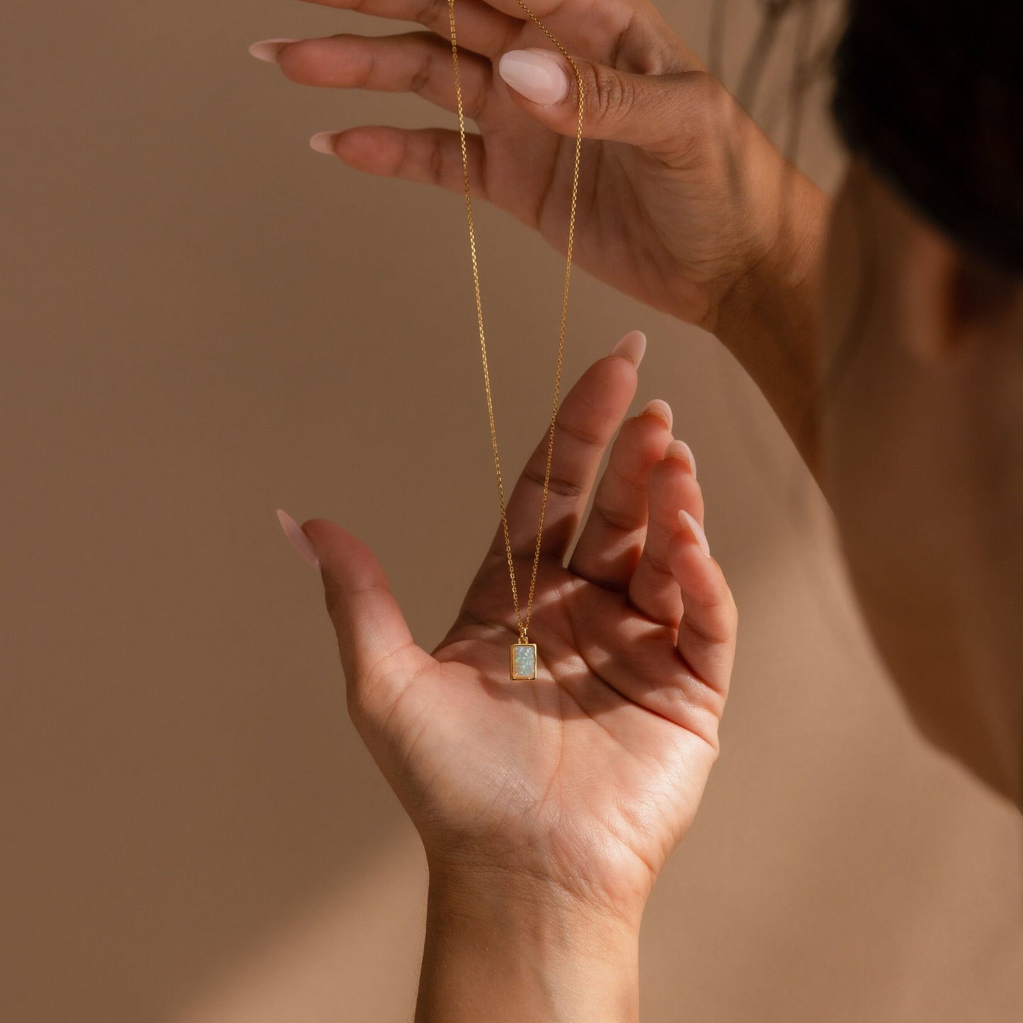 The White Opal Rectangle Necklace features a minimalist design with a white opal charm, perfect for bridal jewelry, shown on a textured beige stone background.