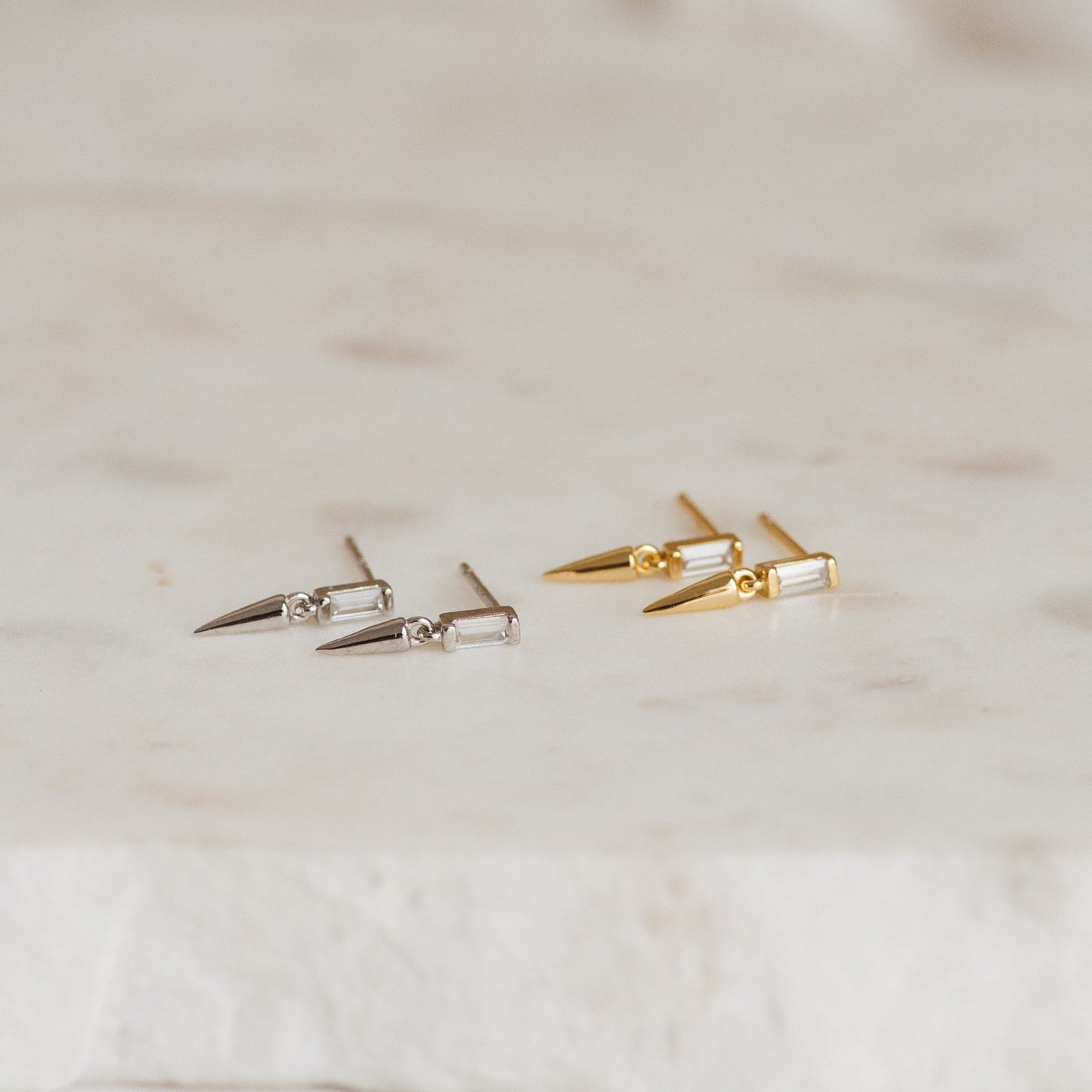 Viste tu atuendo con nuestros aretes colgantes en forma de punta. Con hermosos diamantes CZ baguette y un diseño liviano, tienen un atractivo atemporal que agregará glamour instantáneo a cualquier conjunto.