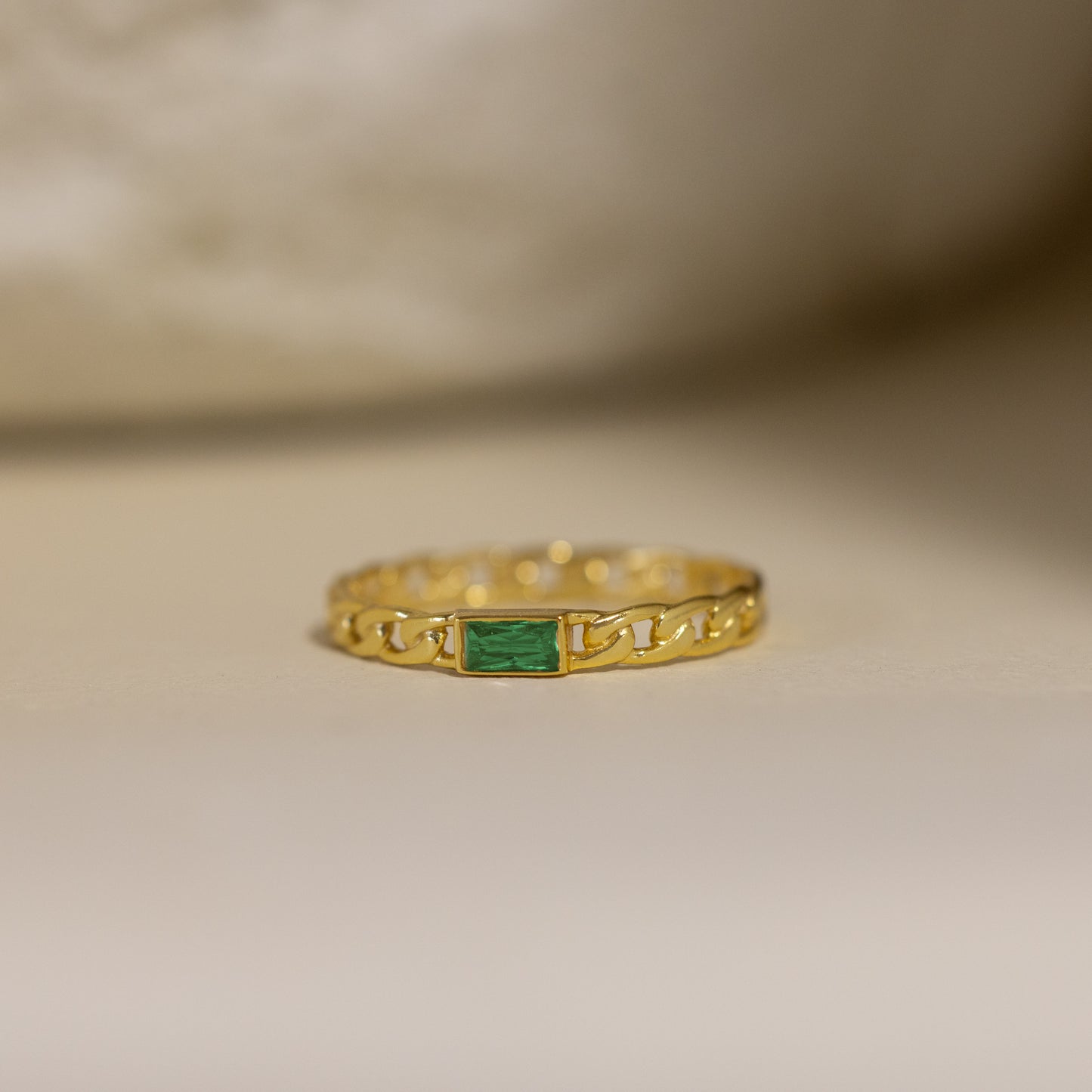 Notre bague gourmette émeraude baguette allie élégance et raffinement. Son élégant anneau gourmette est orné d'une pierre précieuse de votre choix, sertie clos. Une touche de personnalisation moderne : la pièce idéale pour celles qui recherchent un luxe discret et une touche de caractère ✨