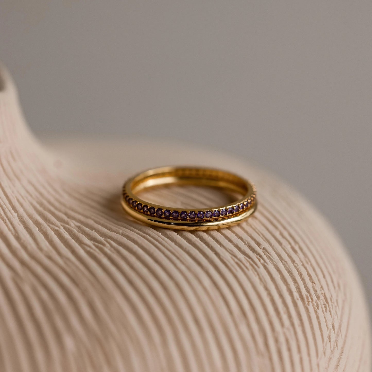 The Birthstone Tennis Ring Set in Garnet (January) features a classic gold band and a gemstone eternity ring with small red stones, both elegantly displayed on a neutral surface.
