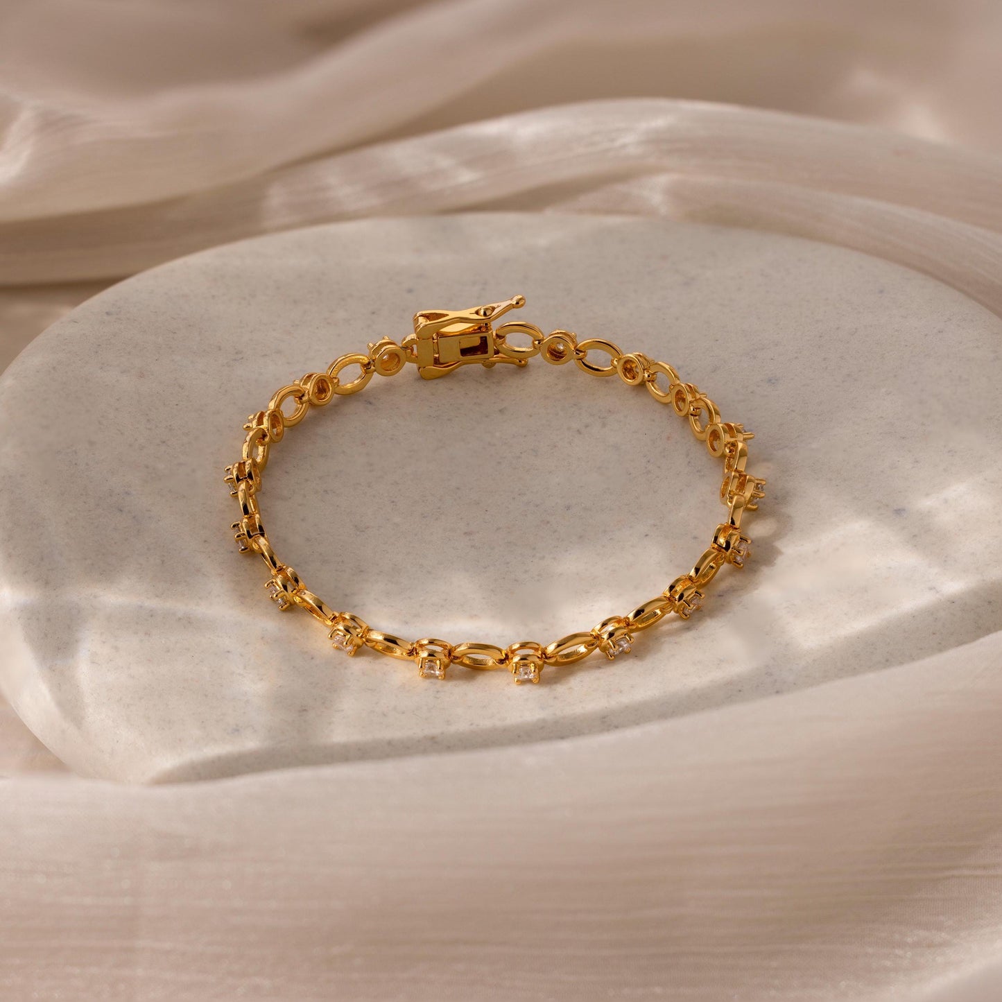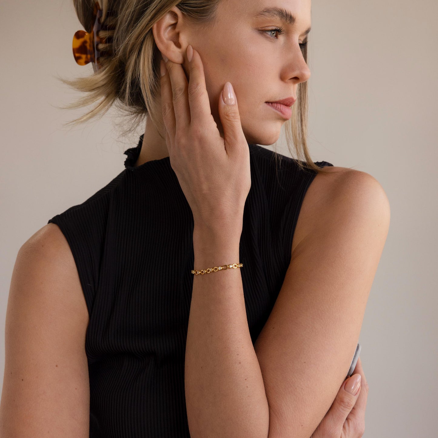 The Diamond Chain Tennis Bracelet, featuring gold links and round clear stones, is worn elegantly with a sleeveless black top.