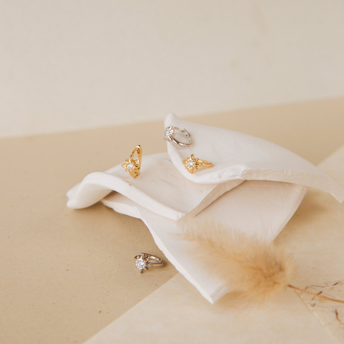 Enya Huggies gold earrings with star-shaped prong designs rest on folded white fabric, accented by a dried grass stem—ideal for those who love delicate details and iridescent diamond sparkle.