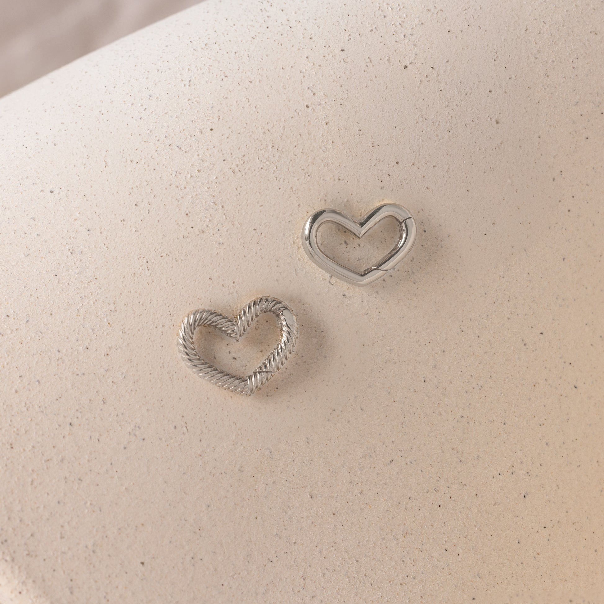 Ajoutez une touche d'originalité à vos bijoux avec notre ensemble de mousquetons cœur ♡. Composé de deux mousquetons en forme de cœur, l'un avec une finition polie et l'autre avec une texture corde audacieuse, cet ensemble allie charme et polyvalence. Utilisez-les comme connecteurs pour bracelets à breloques, colliers ou porte-clés et créez un look unique !
