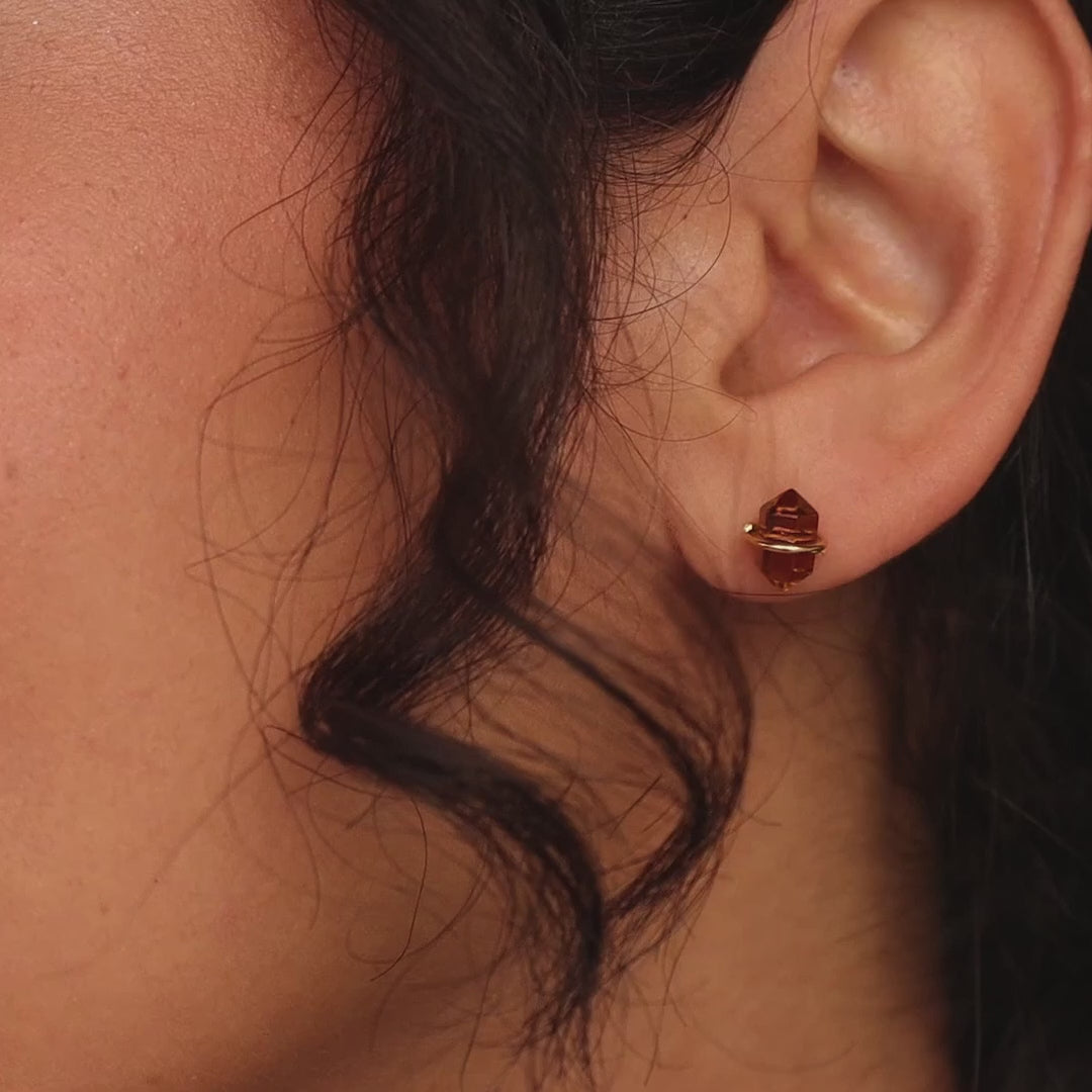 Herkimer Smoky Quartz Studs in gold and brown tones rest elegantly on soft, beige fabric.